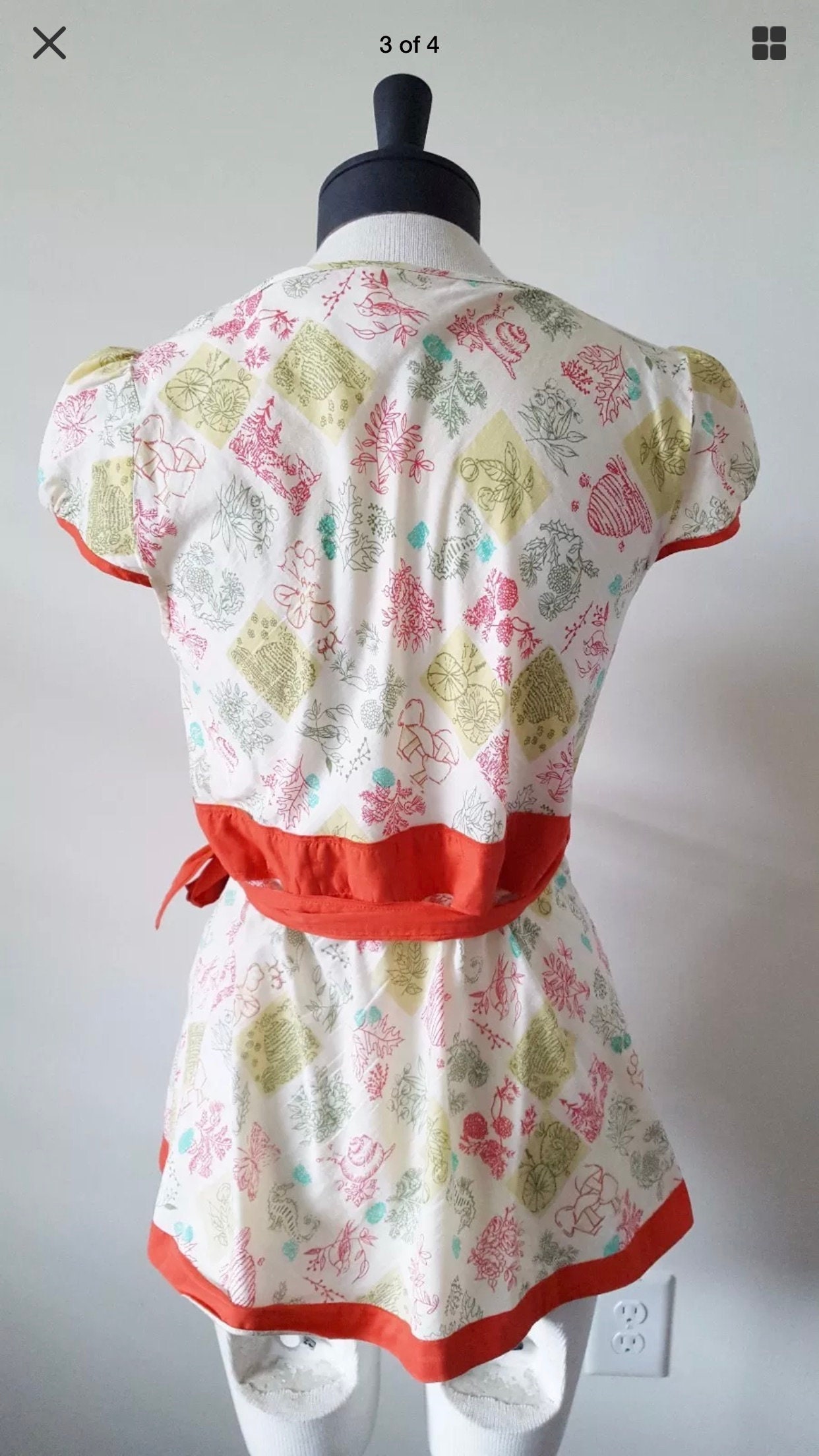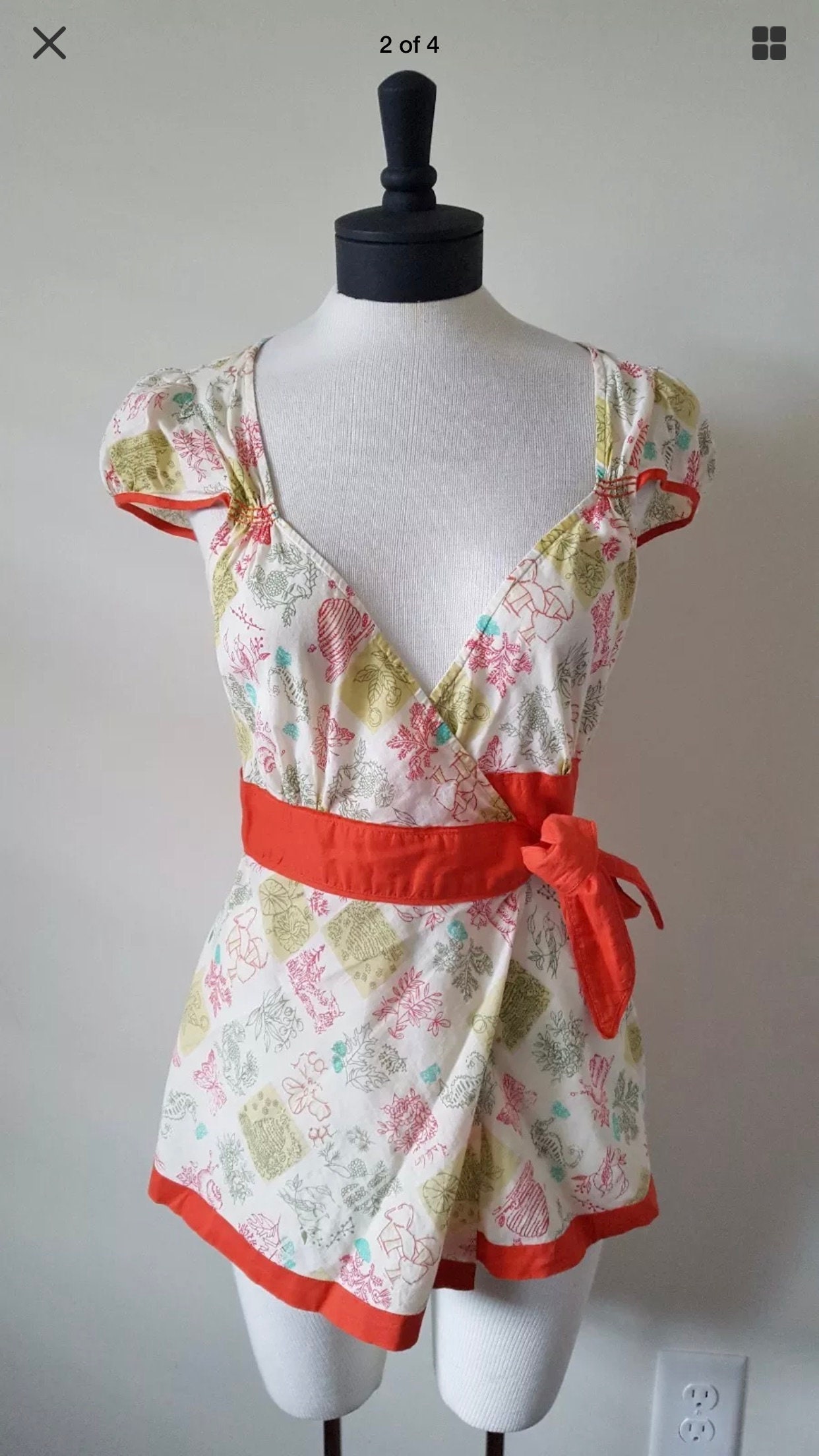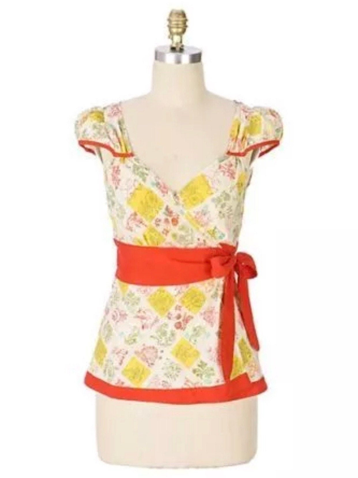 Vintage Anthropologie Cotton Smock Blouse named after Ogunquit Beach Maine, Capped Sleeves, Wrap Front Country Cottage Style Print Top- size medium - now rare