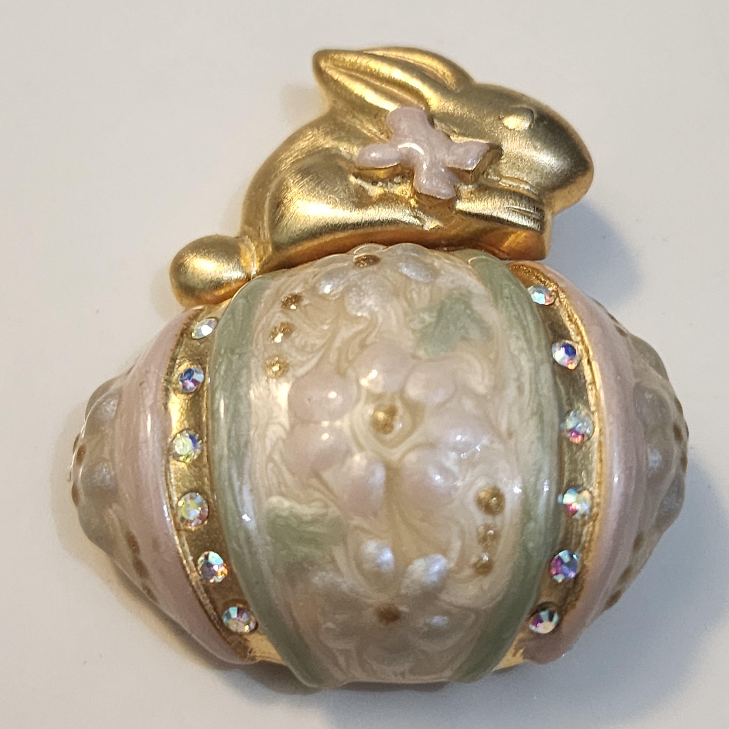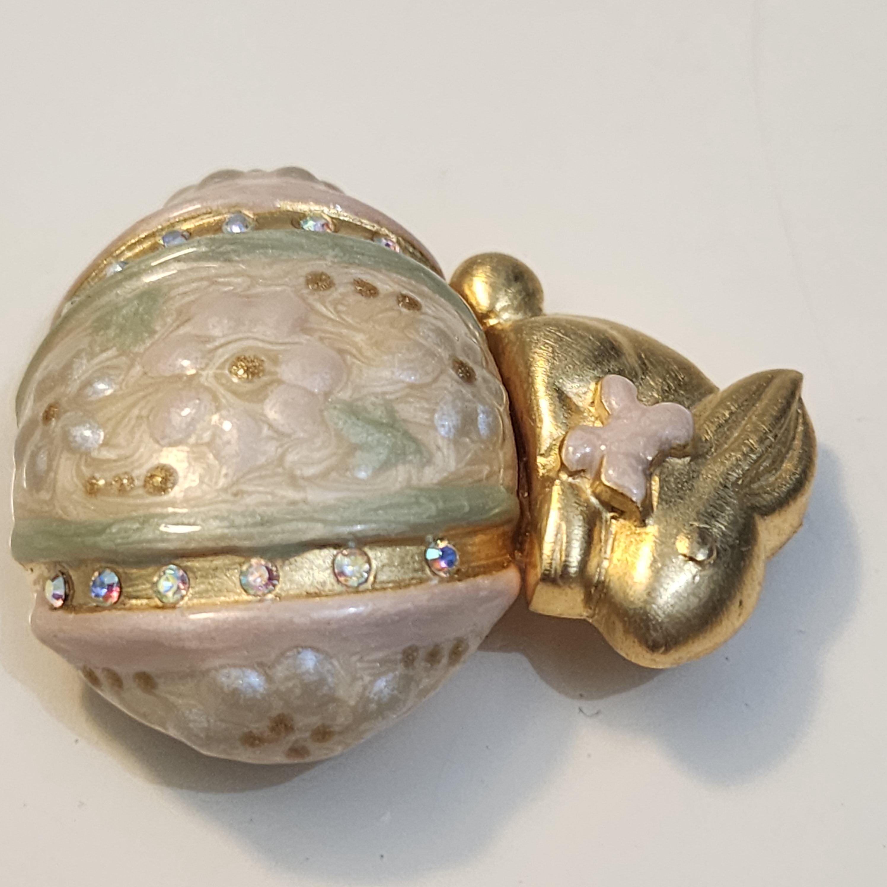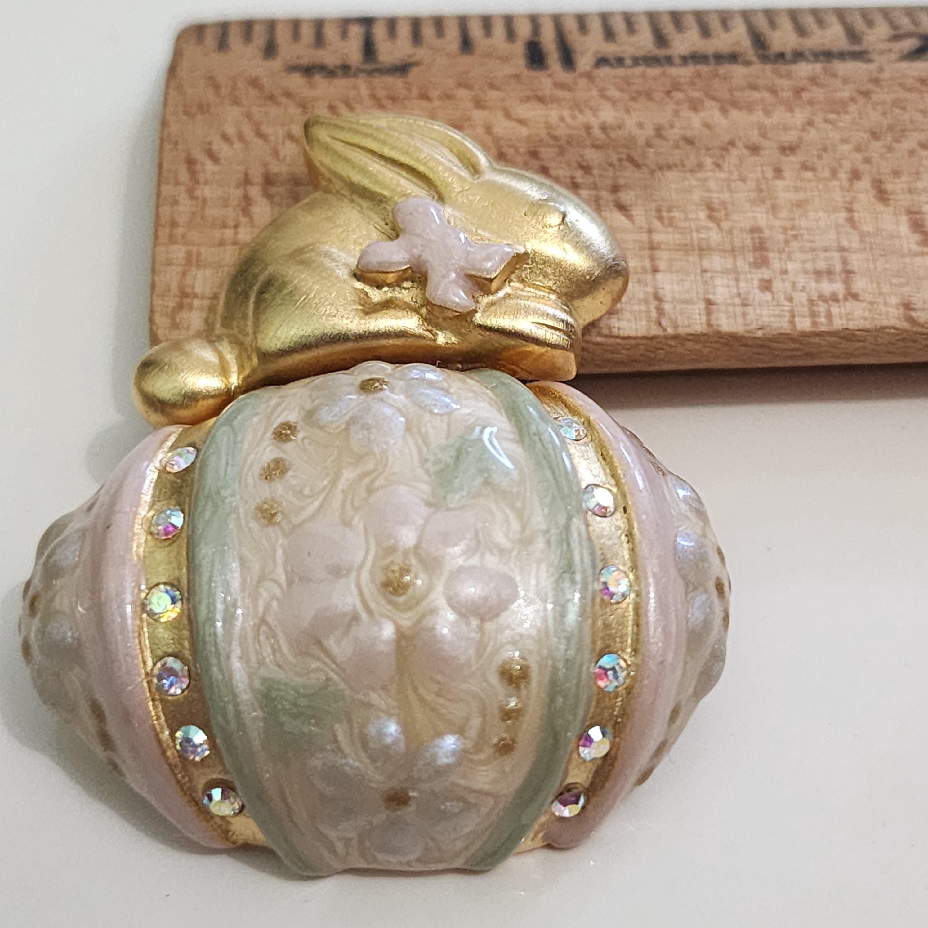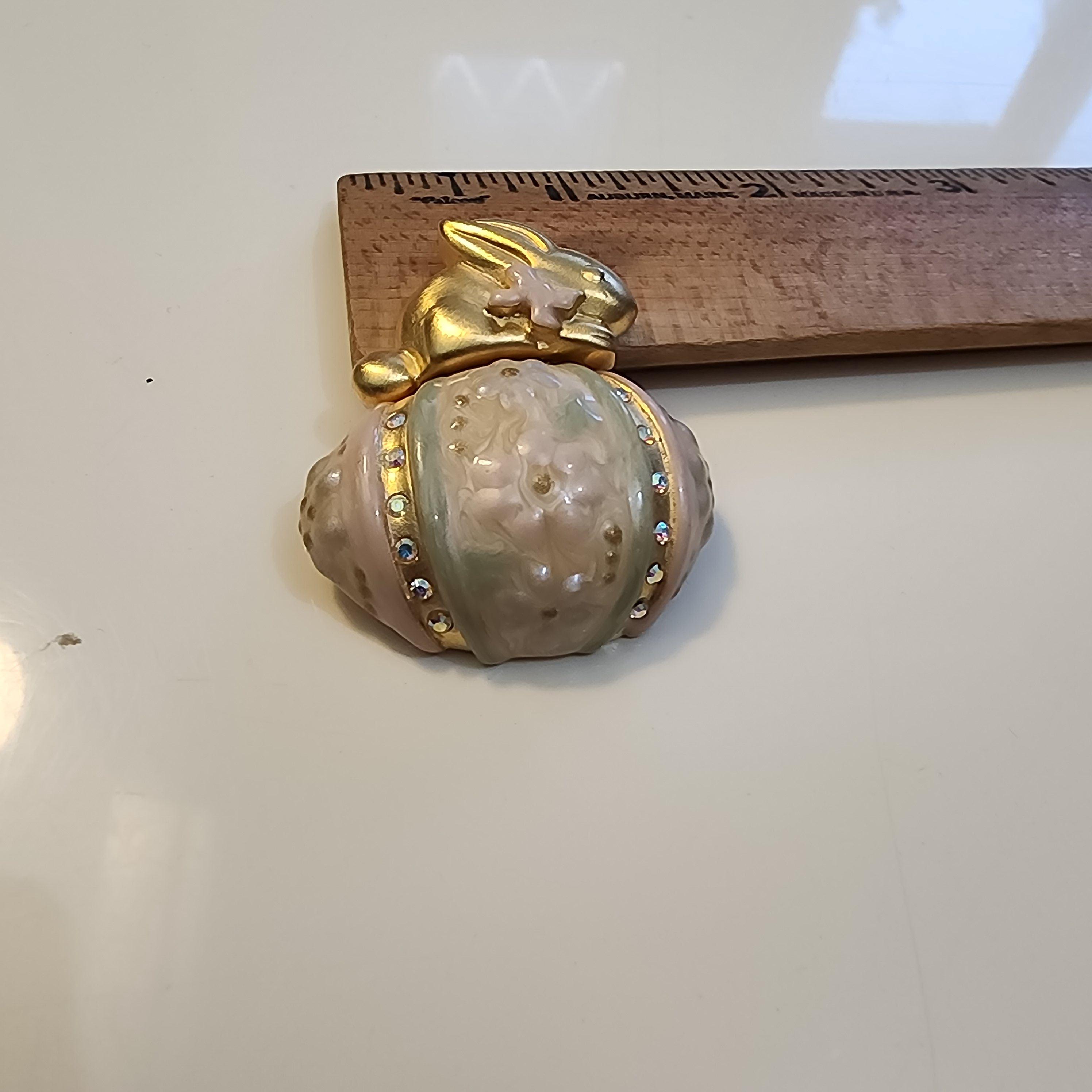 Vintage Bunny Rabbit on and Easter Egg Enamel Brooch Pin, Matte Gold tone, signed