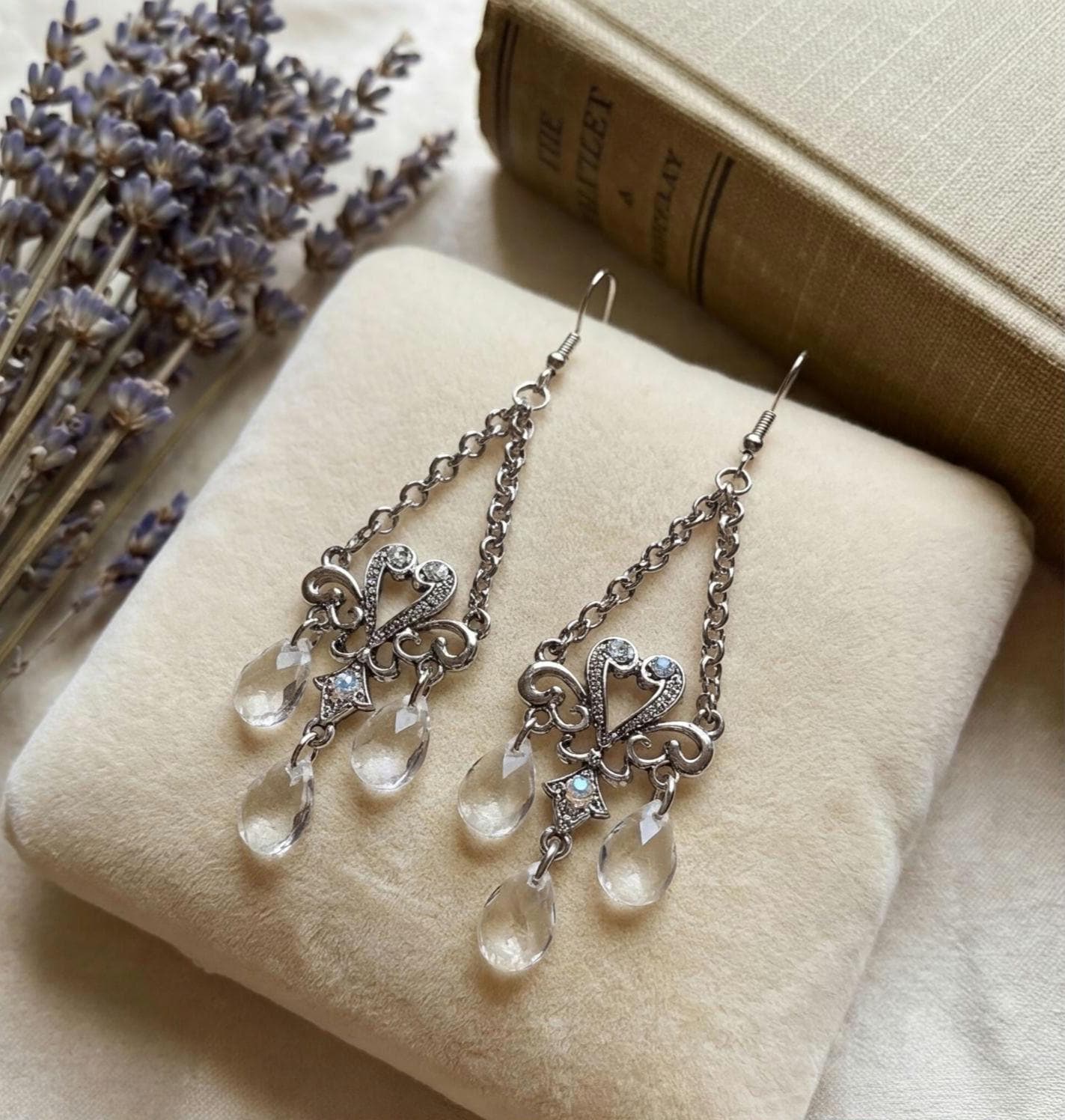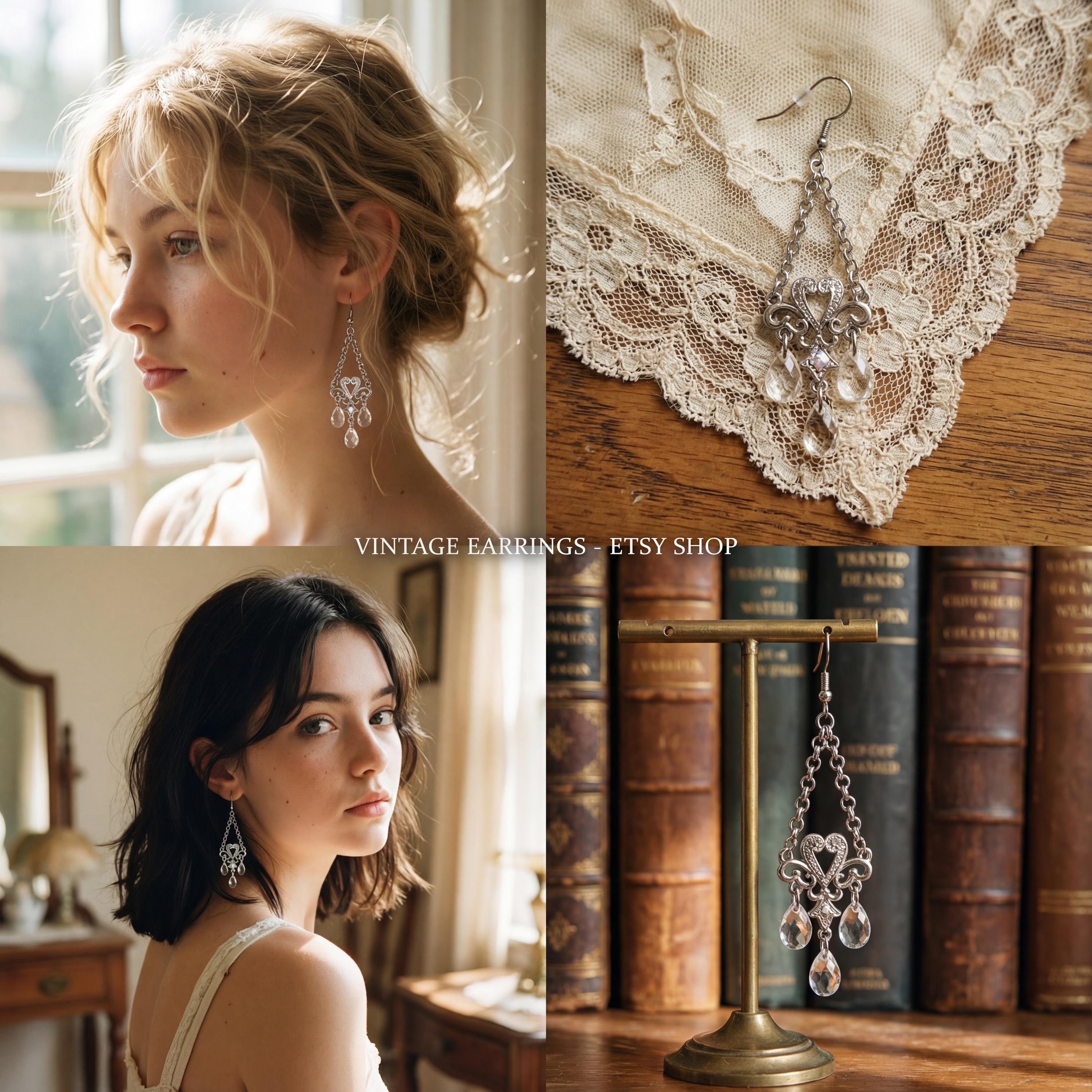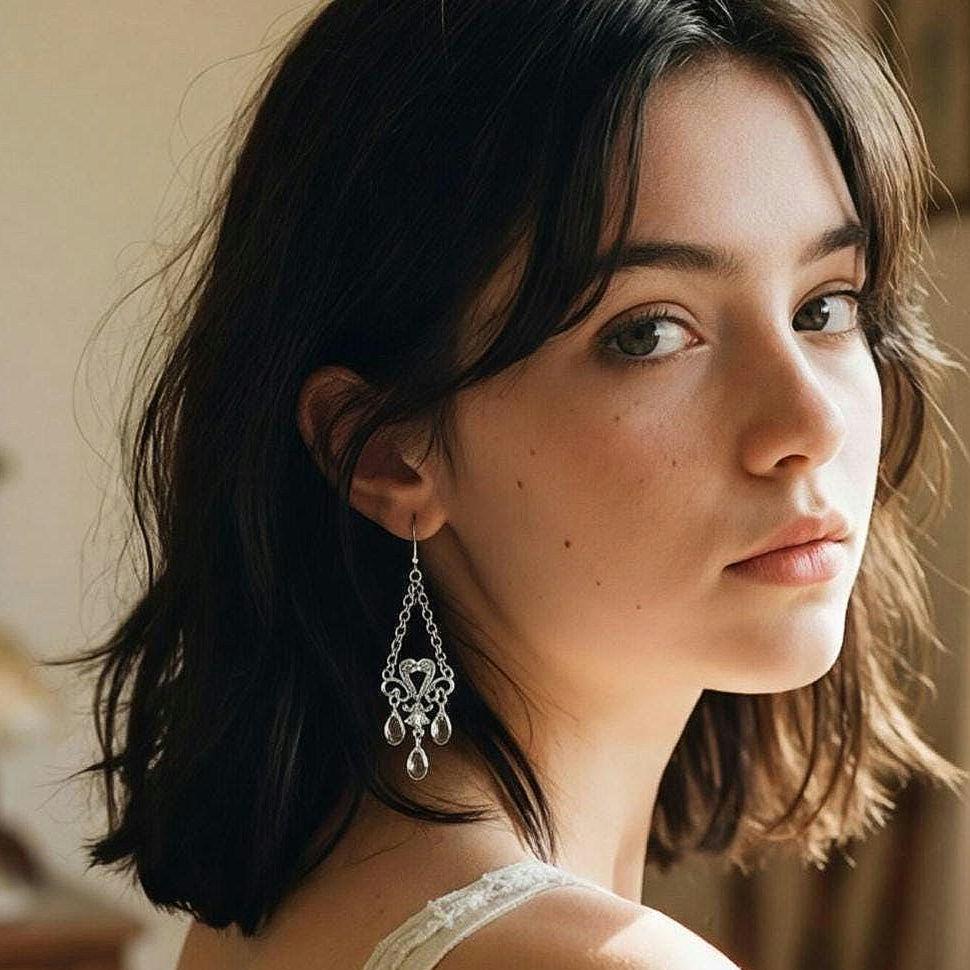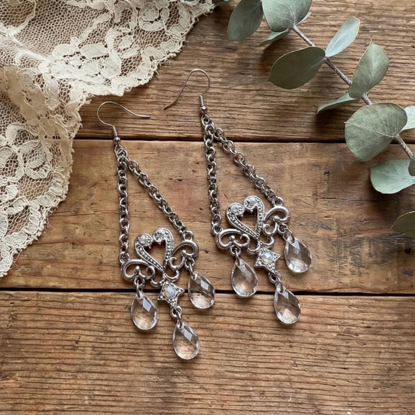Y2K Sparkly Heart & Faux Crystal Chandelier Dangles, Shiny Silver tone Glamour Jewelry Statement Earrings, Vintage Earrings
