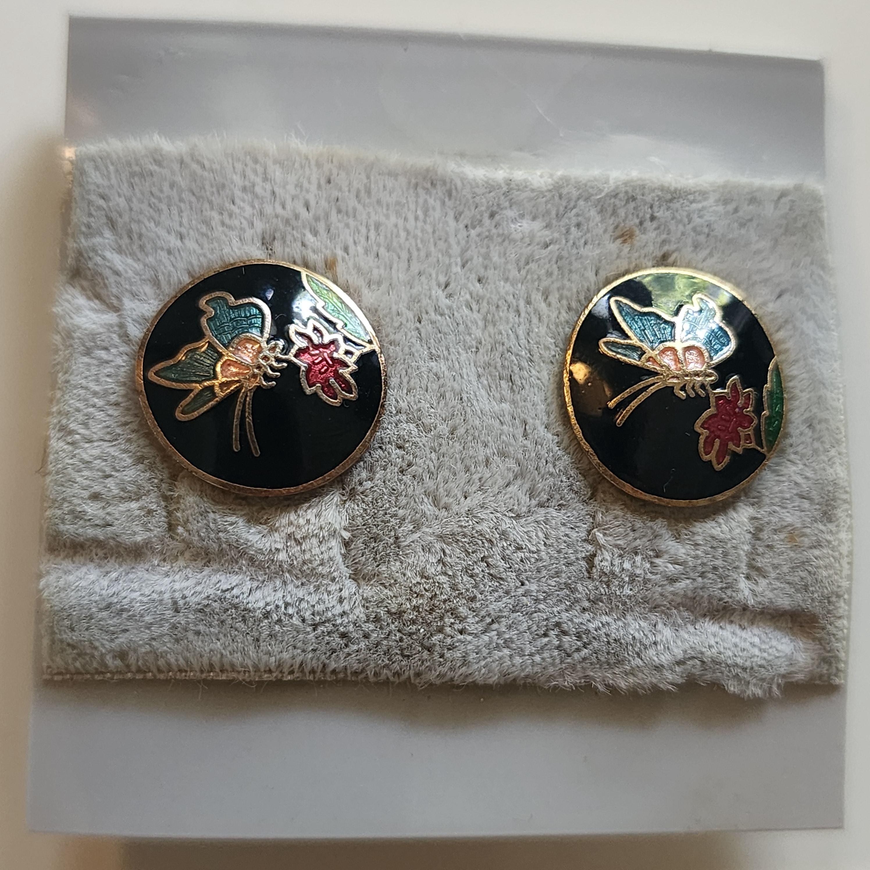 Vintage Cloisonné Art Nouveau Stud Earrings, Enamel Flowers Butterflies