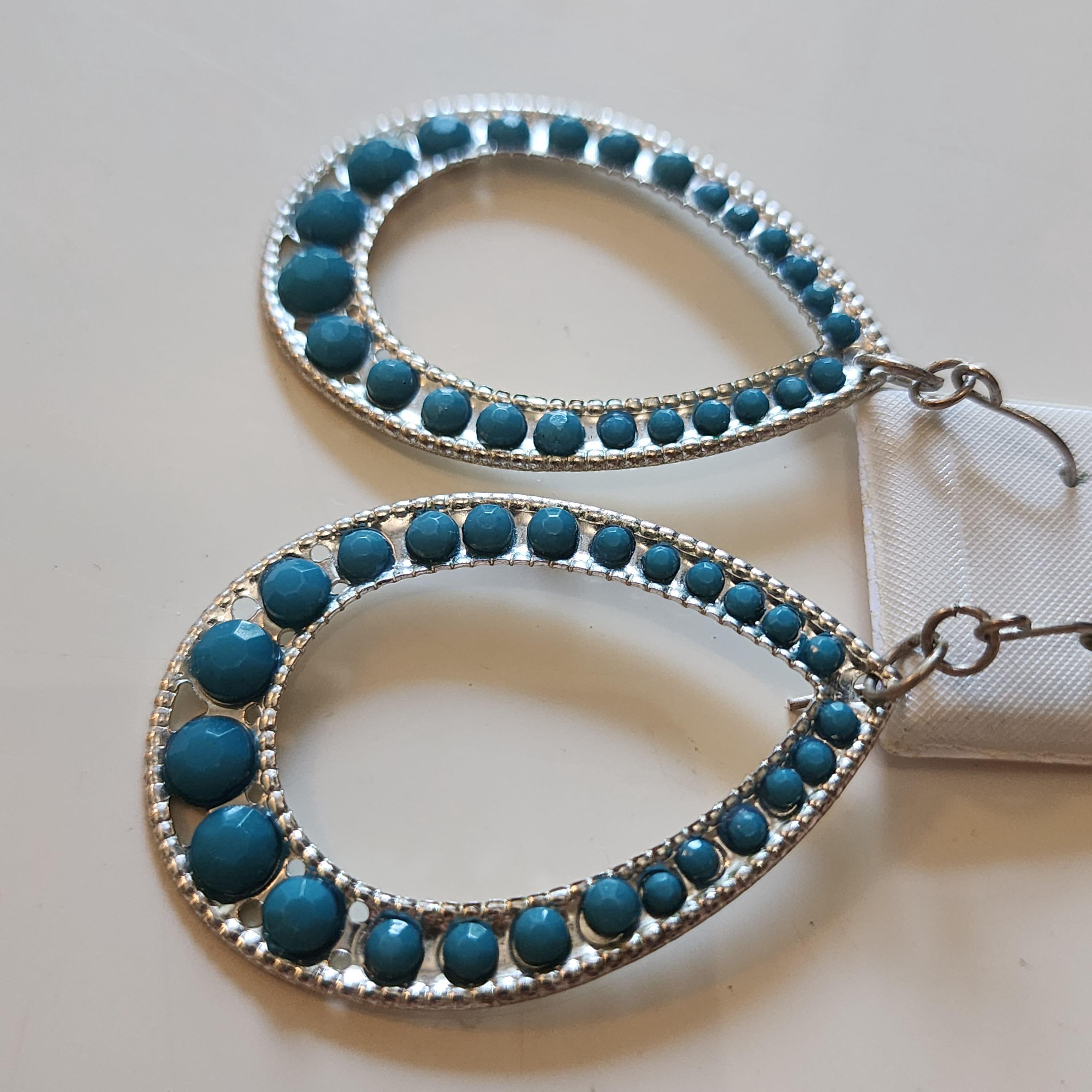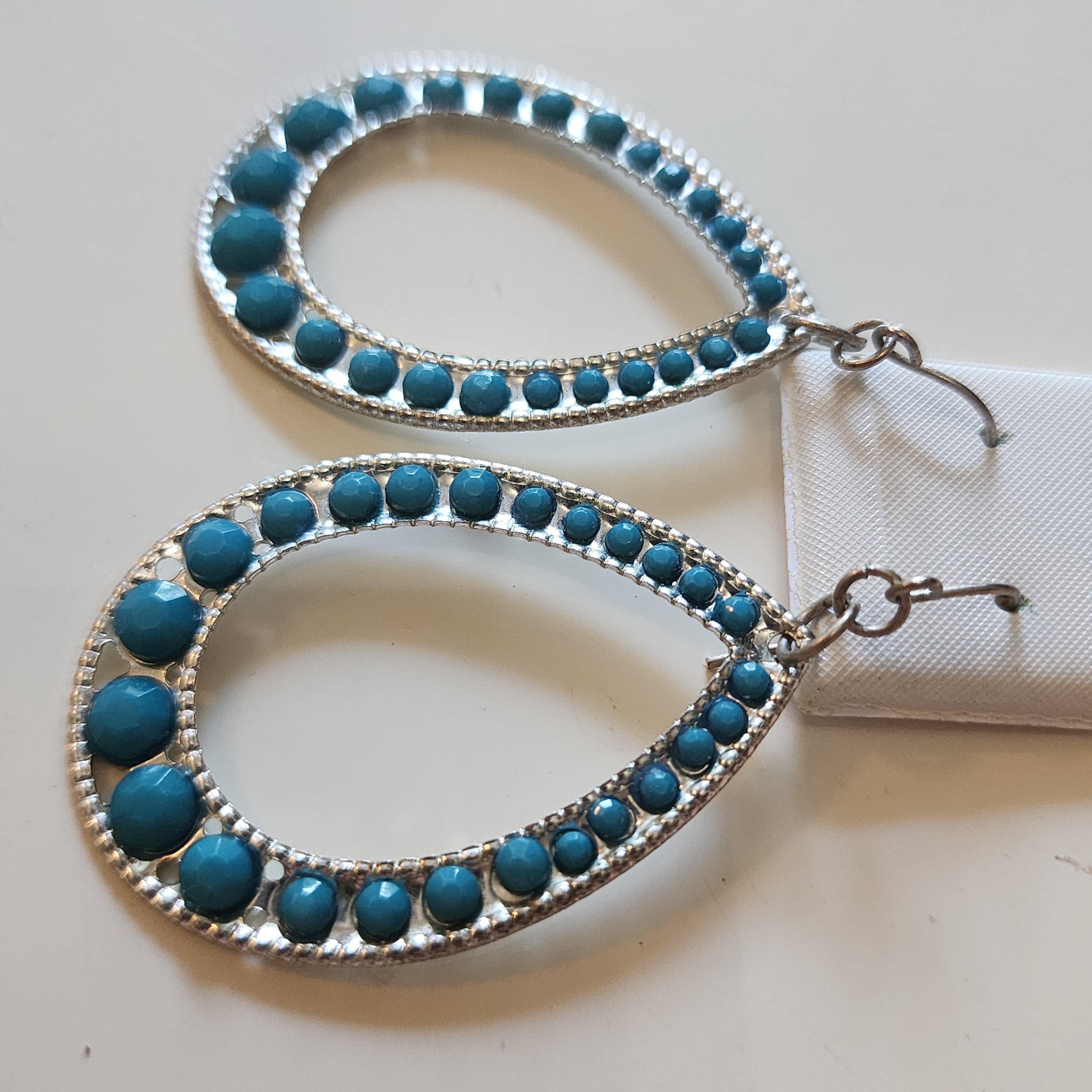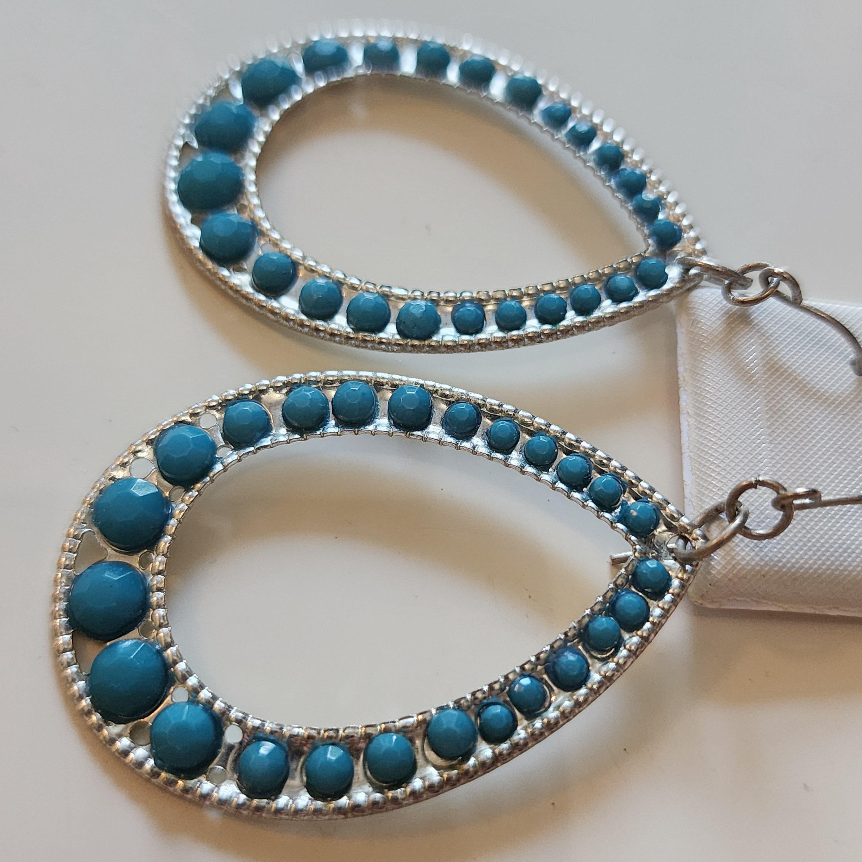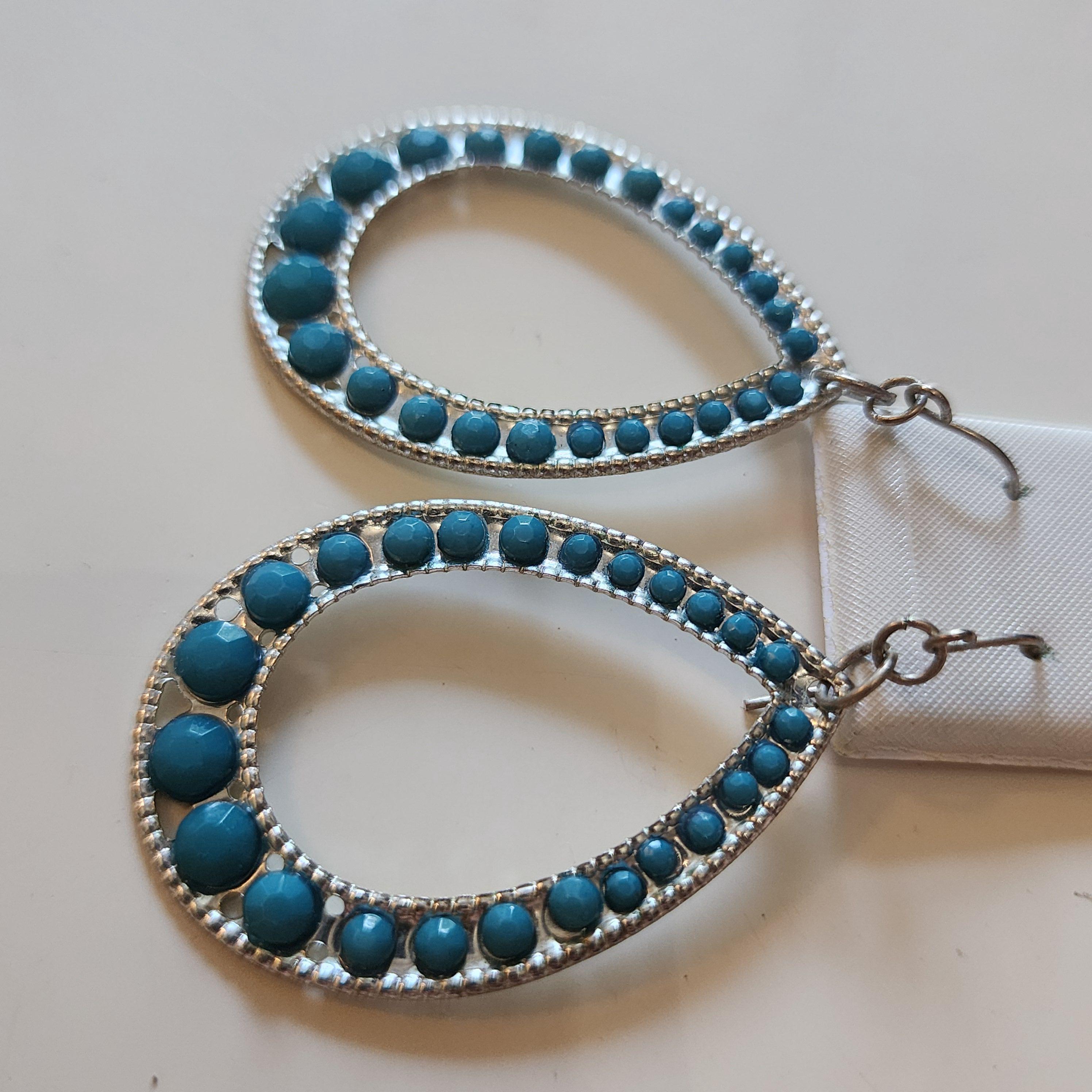 Gentle on ears, light weight silver tone teardrop hoops with acrylic turquoise faceted gems along entire earring- very pretty! A nice take on southwestern & cowgirl fashion. great with jeans, cottagecore prairie fashion or dessert resort & festival styles!