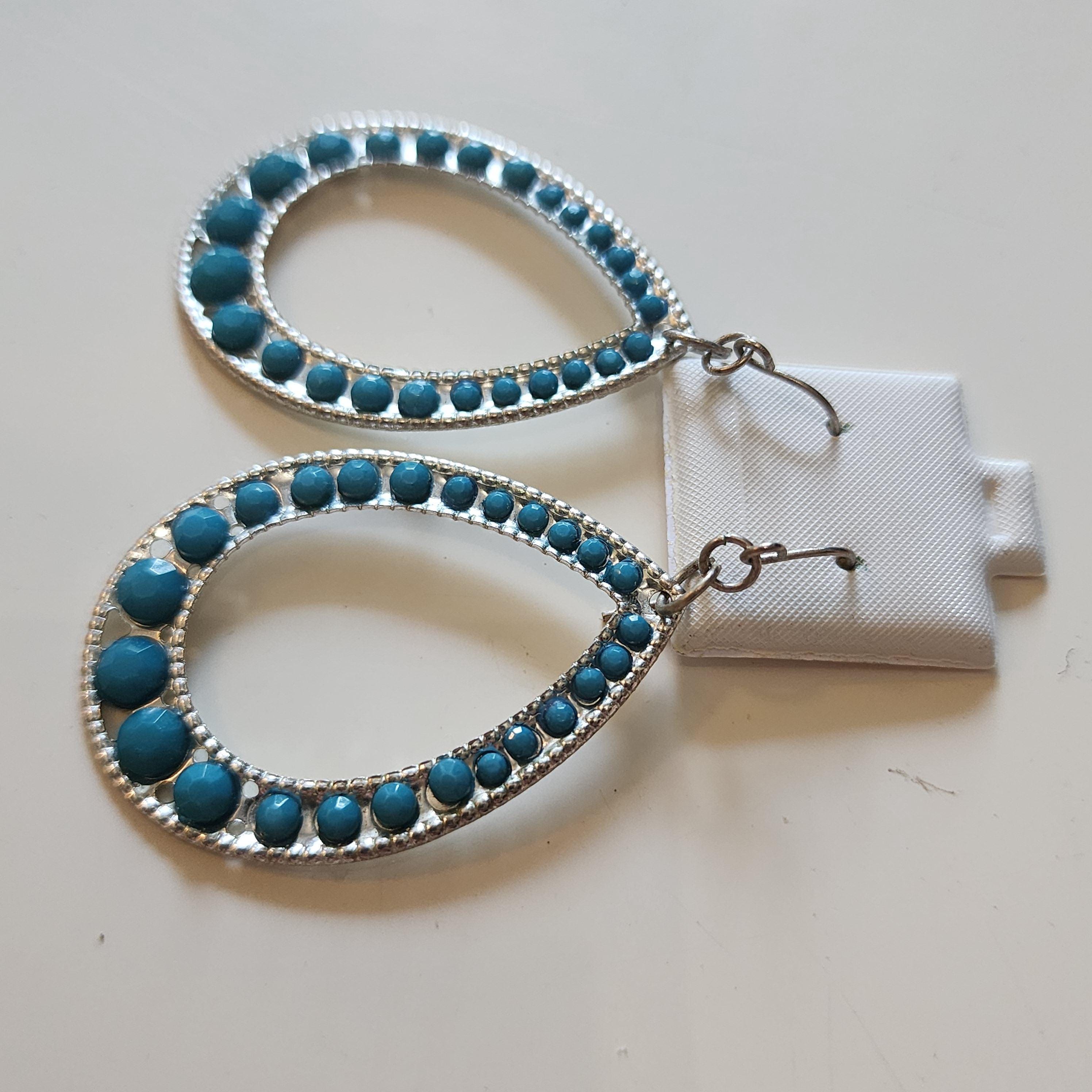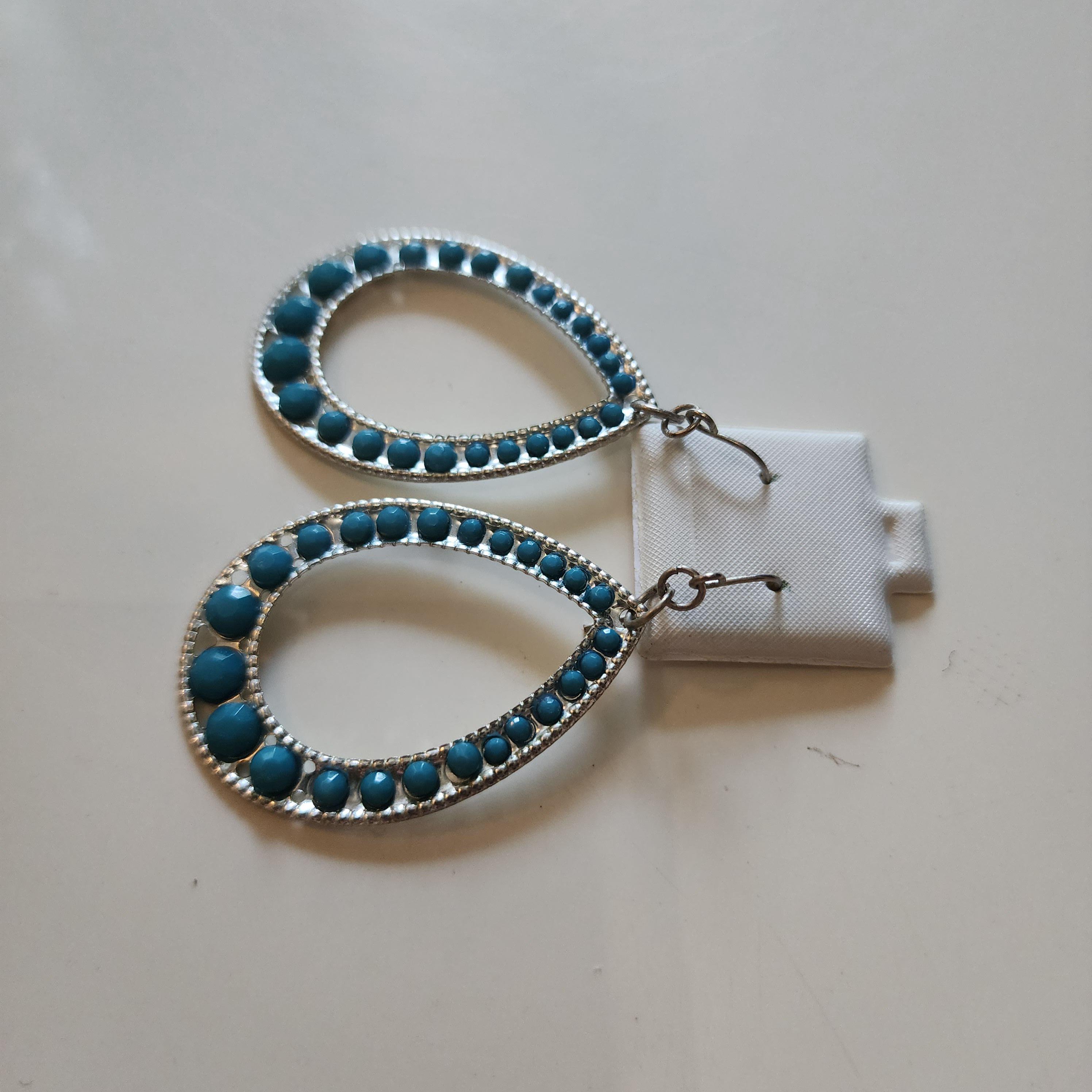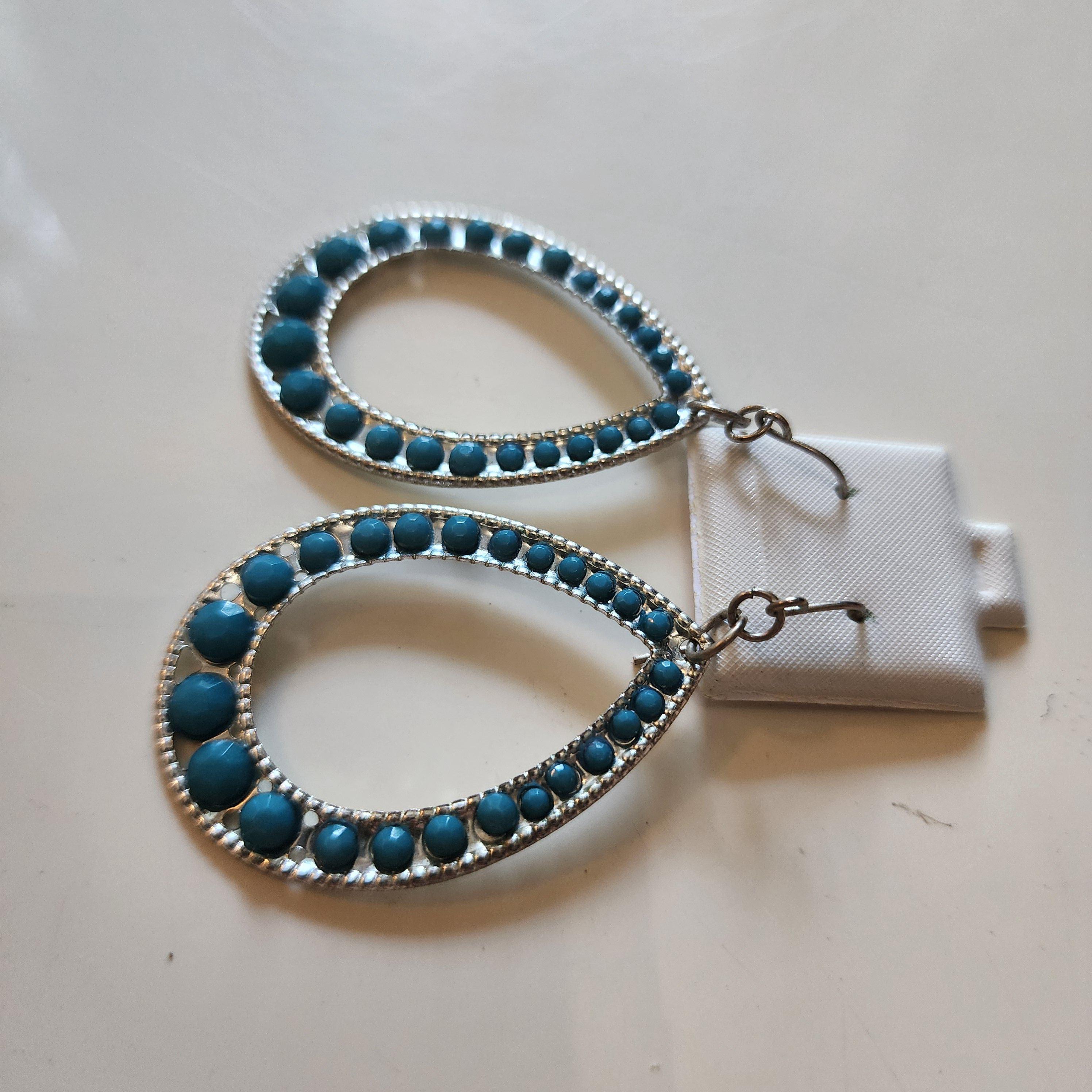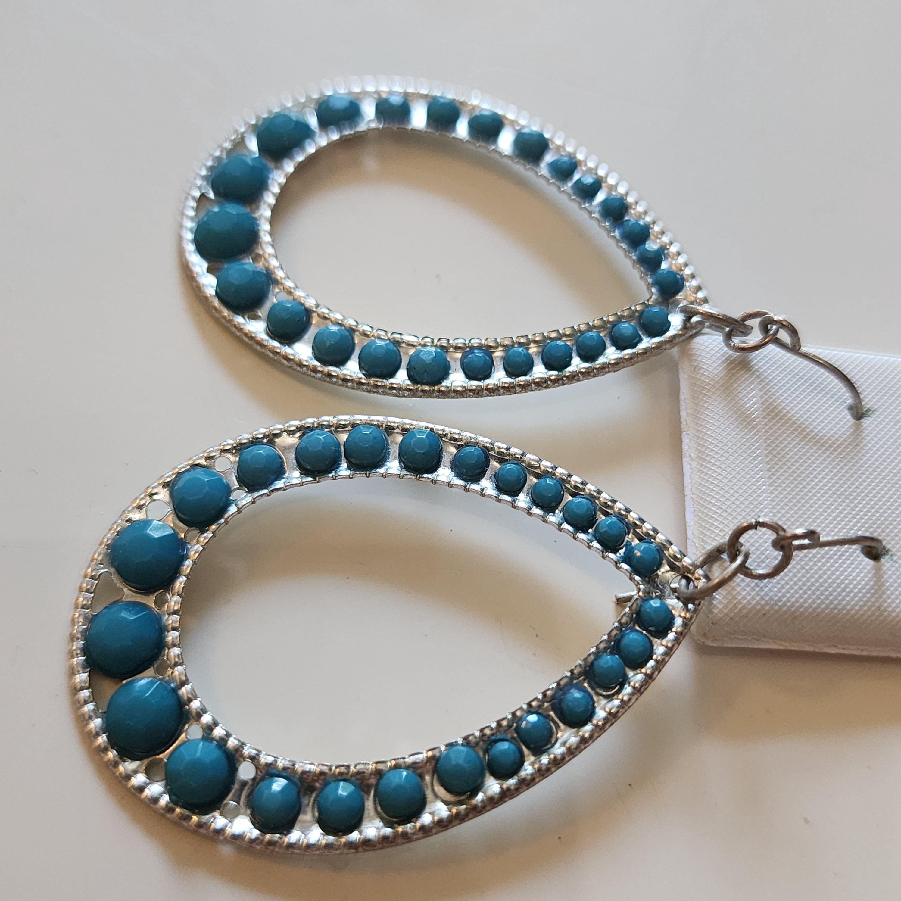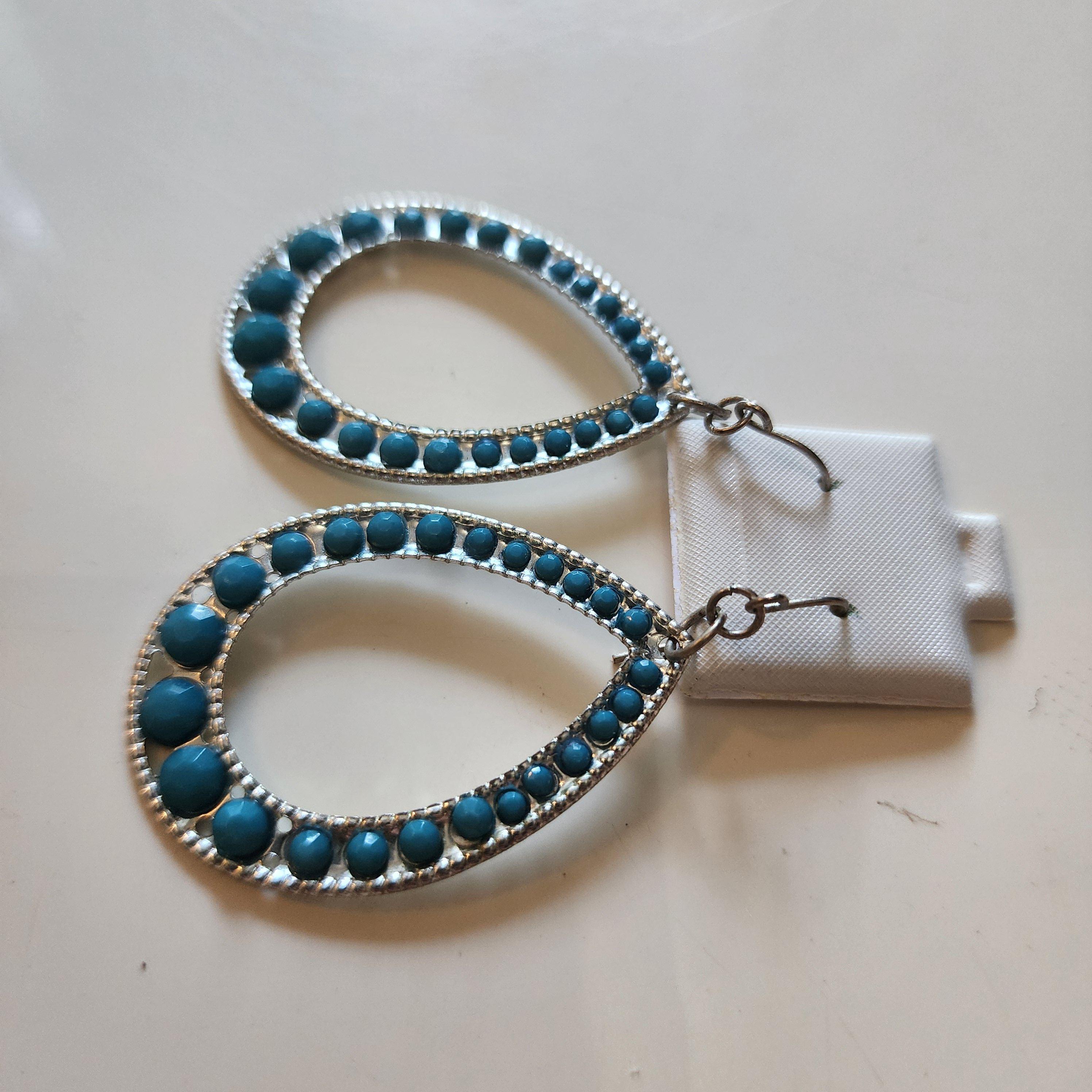 Gentle on ears, light weight silver tone teardrop hoops with acrylic turquoise faceted gems along entire earring- very pretty! A nice take on southwestern & cowgirl fashion. great with jeans, cottagecore prairie fashion or dessert resort & festival styles!
