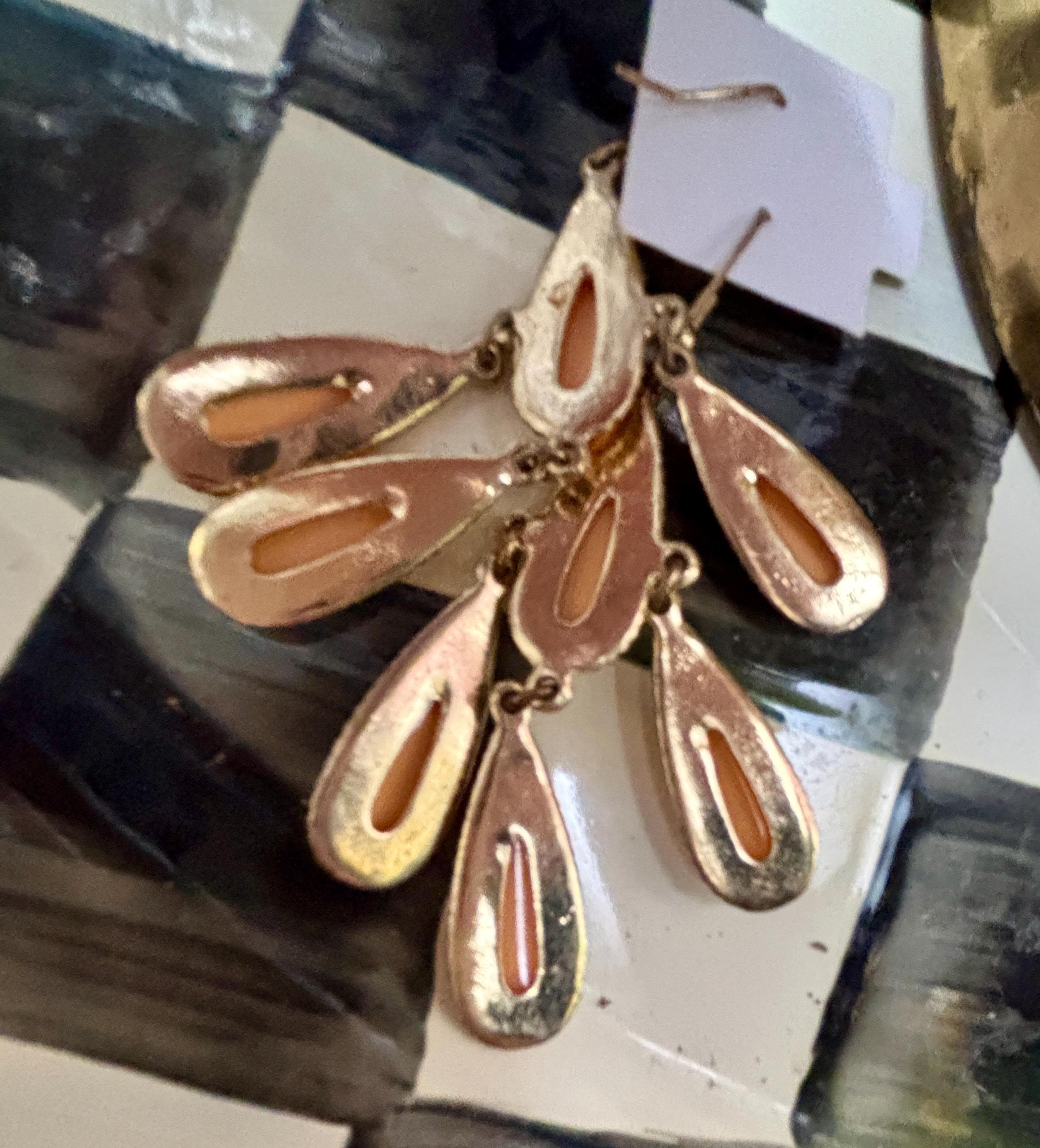 This is a really nice pair of Regency style late 90s early 2000s better quality Costume Jewelry. They have pale peach faceted teardrop cabochons and the goldtone is a nicer quality than most - looks almost soddered or poured into a mold with the gem inside to set the gem & has a shiny like air dried finish - see photos.