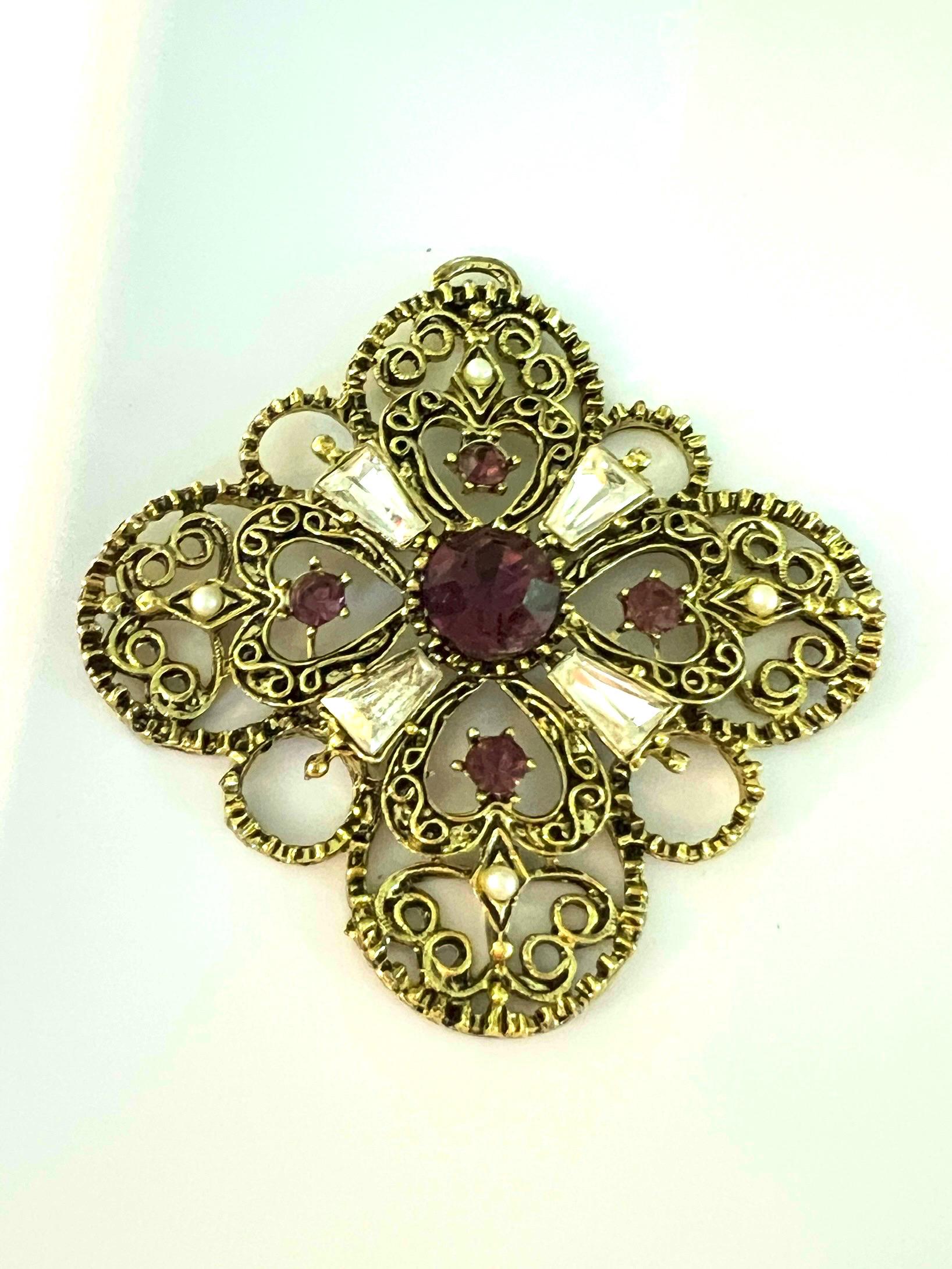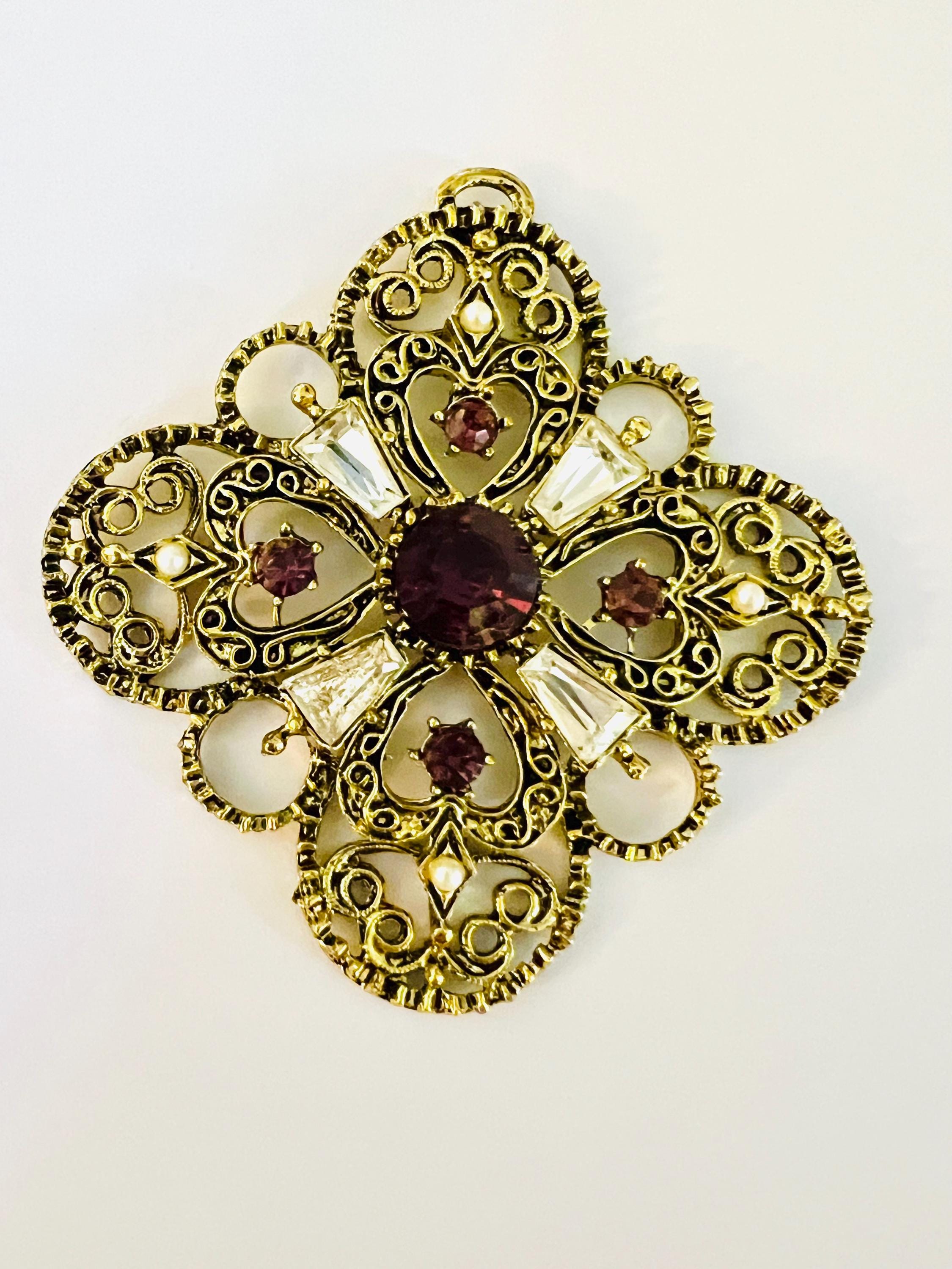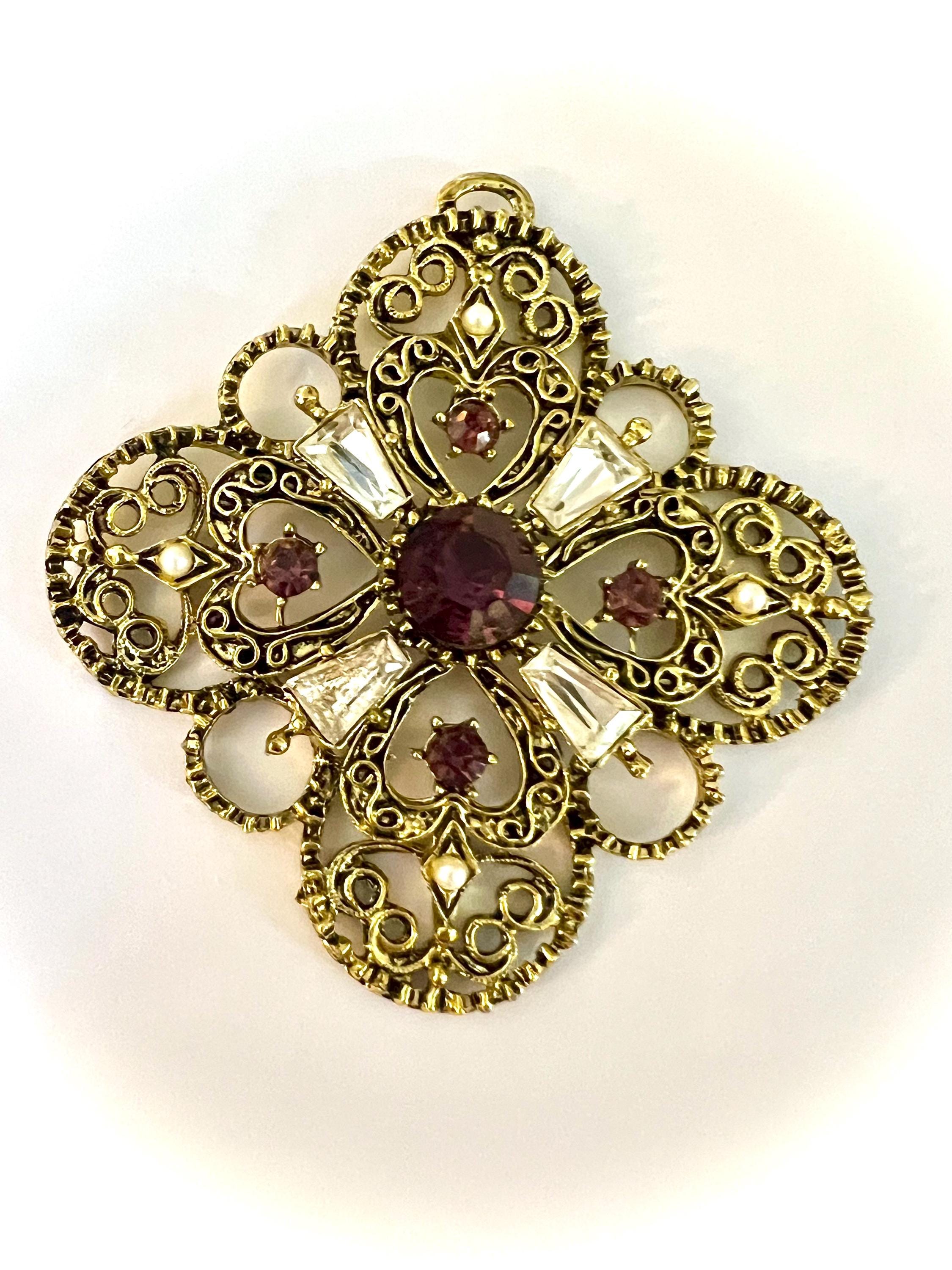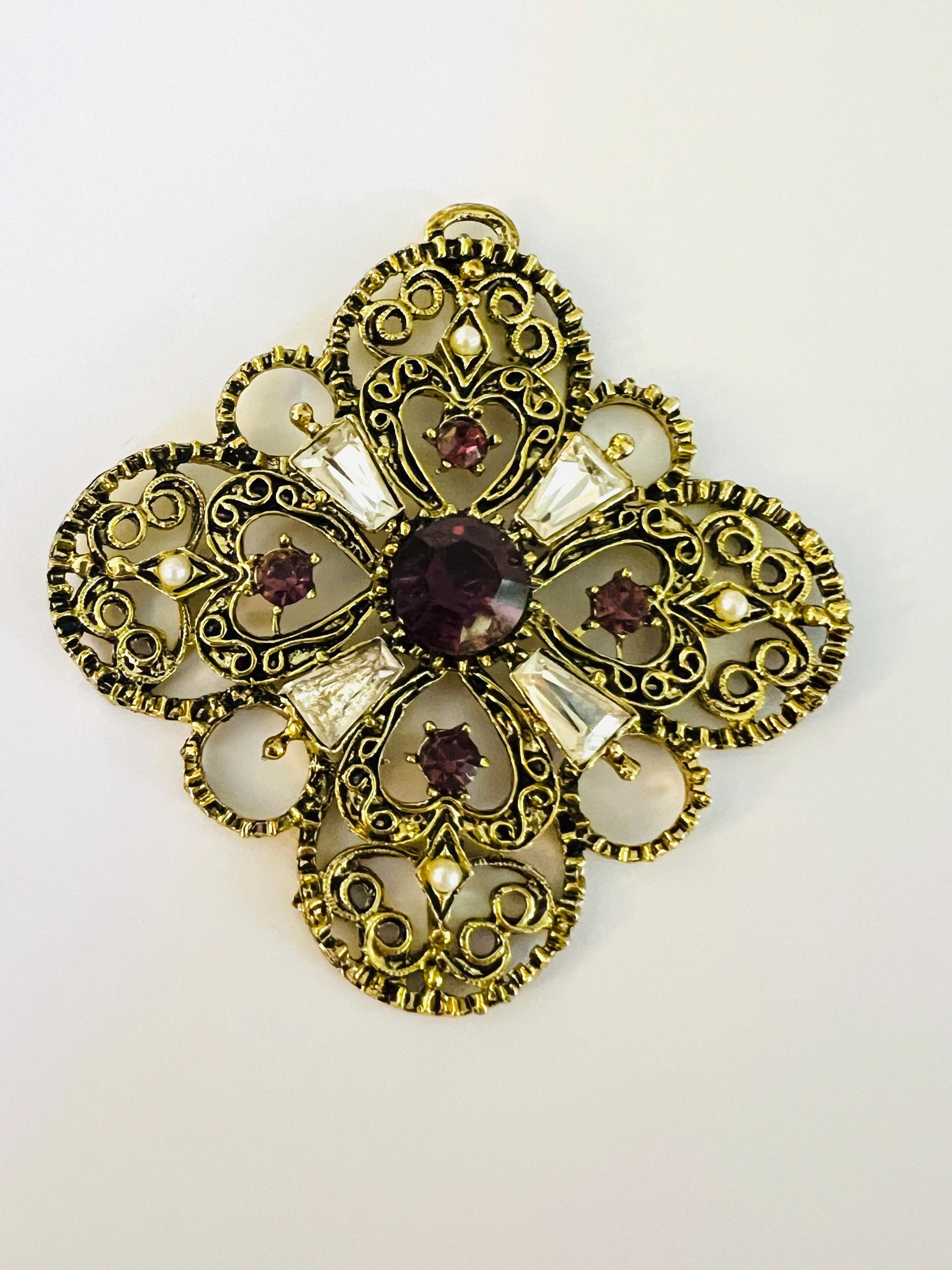 Large Victorian Revival Pendant: Fancy Antiqued Goldtone with Amethyst Rhinestones and Crystal Bagettes -DIY Necklace or Ornament