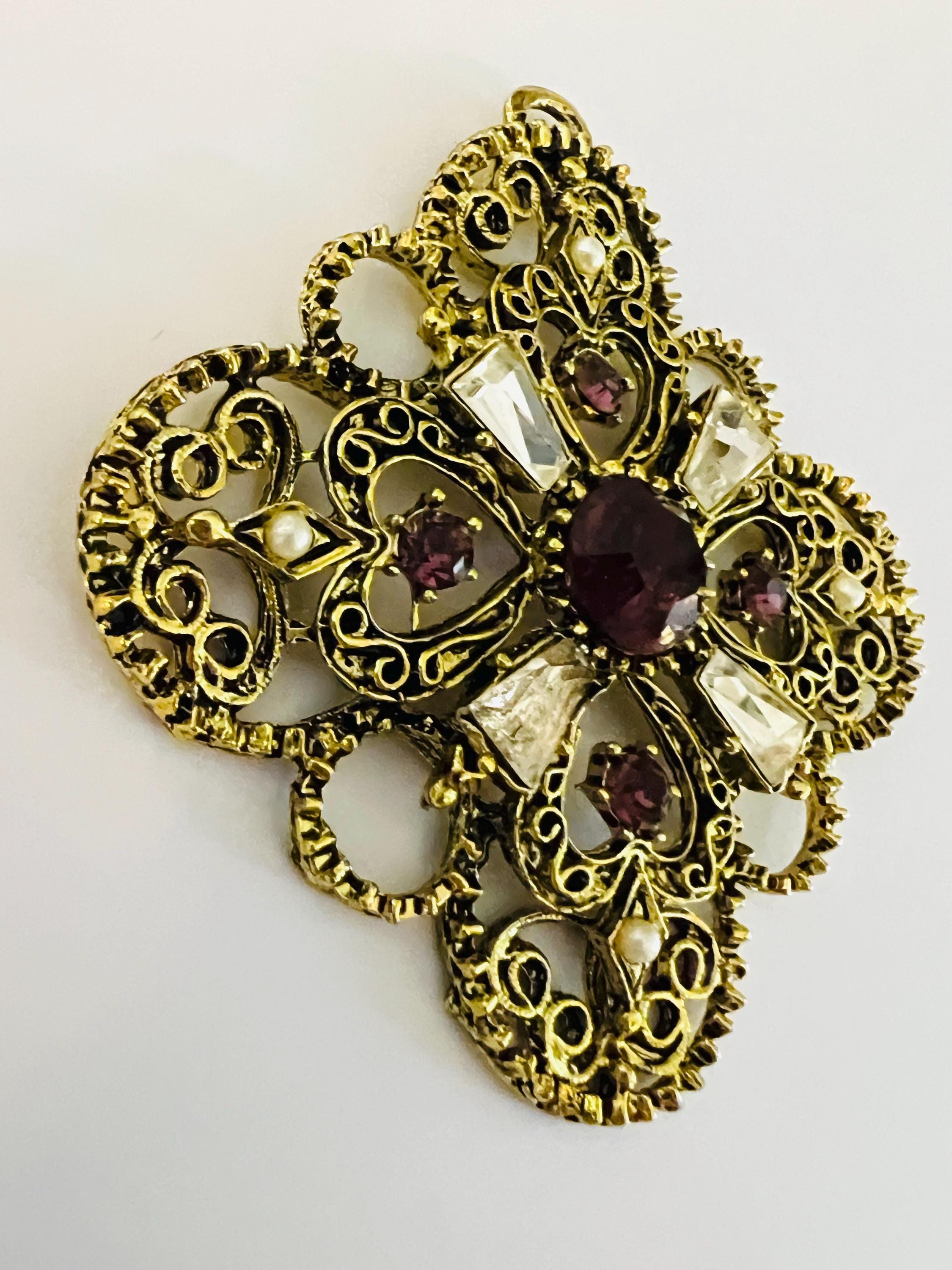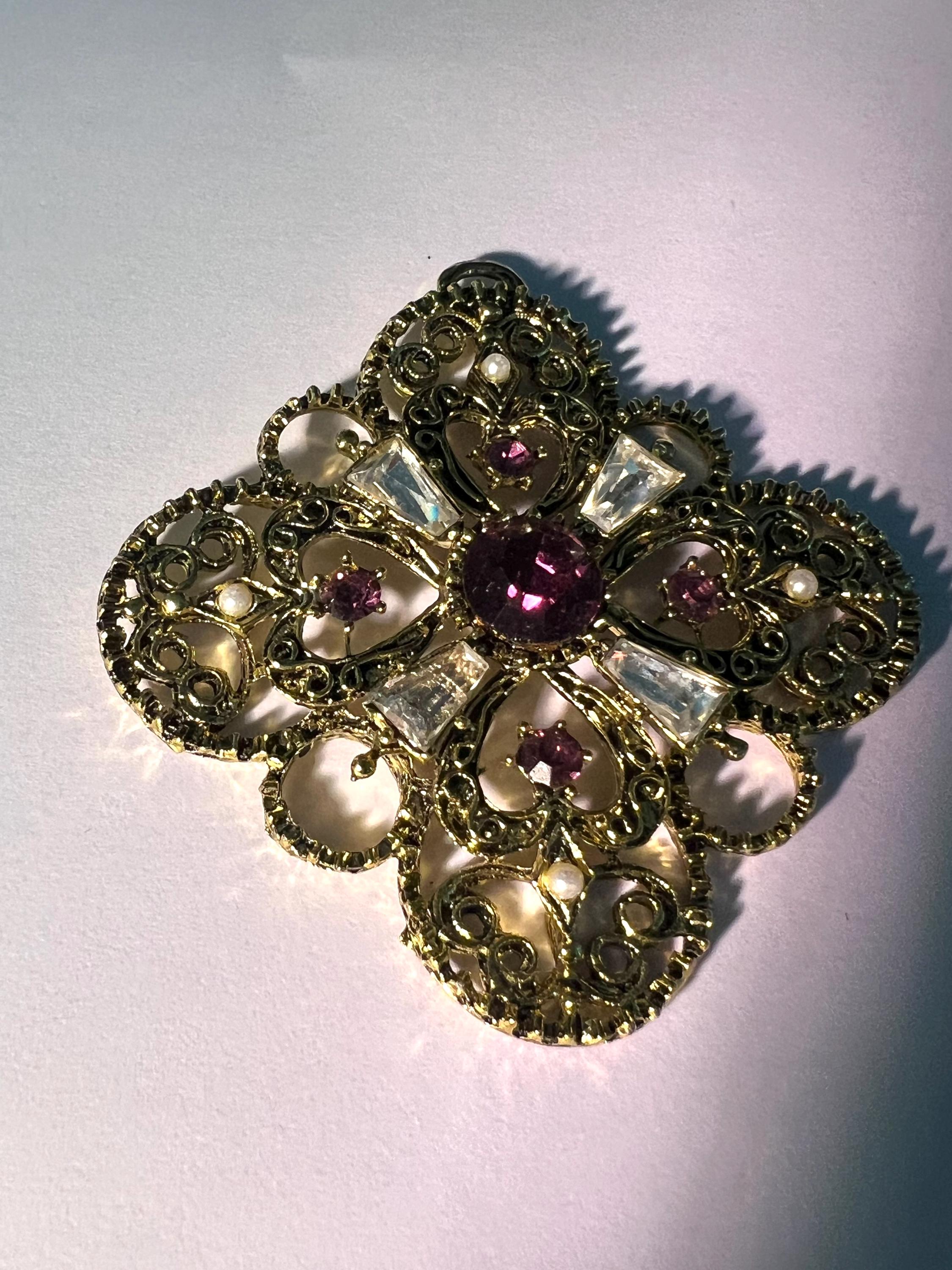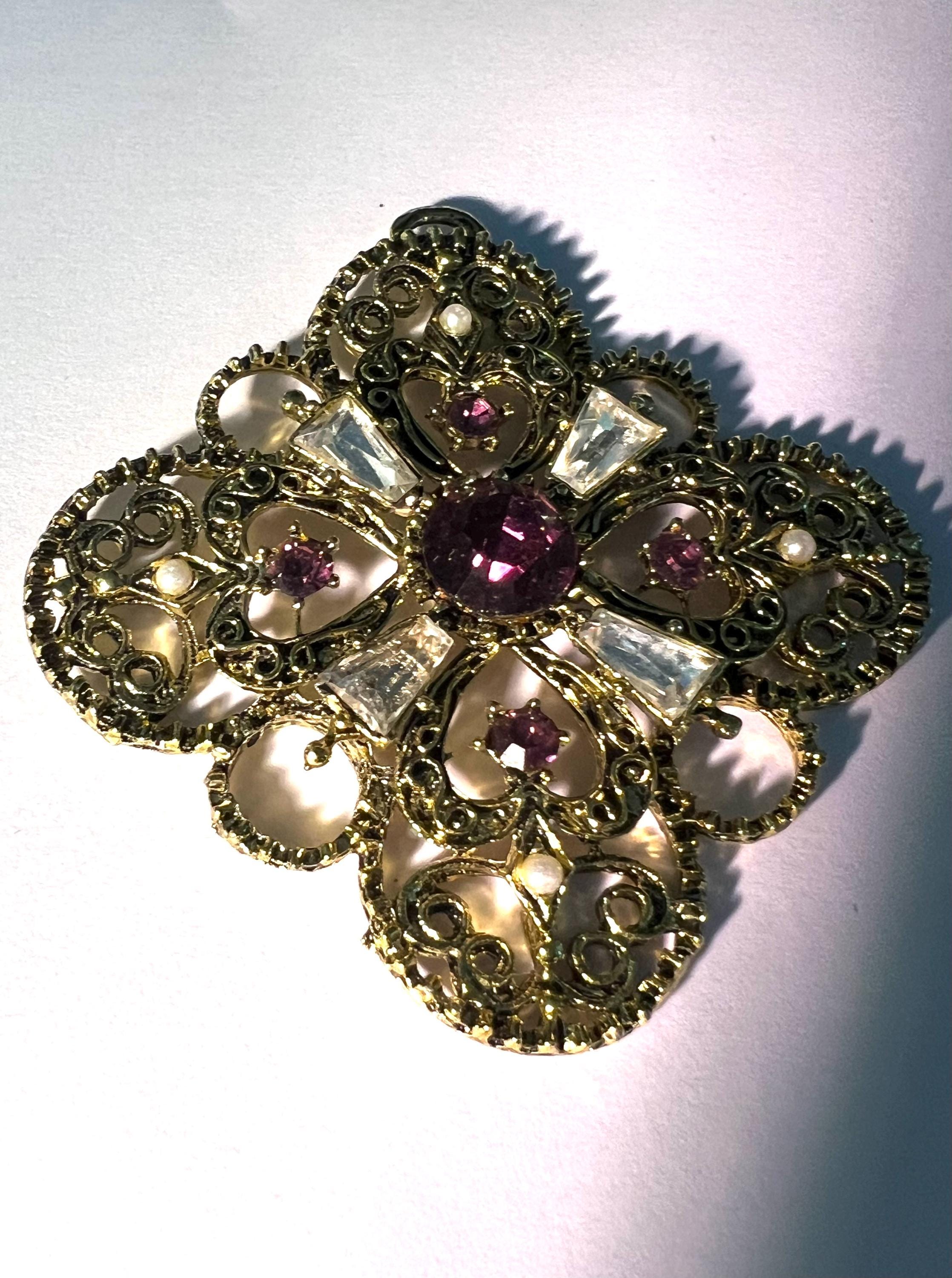 Large Victorian Revival Pendant: Fancy Antiqued Goldtone with Amethyst Rhinestones and Crystal Bagettes -DIY Necklace or Ornament