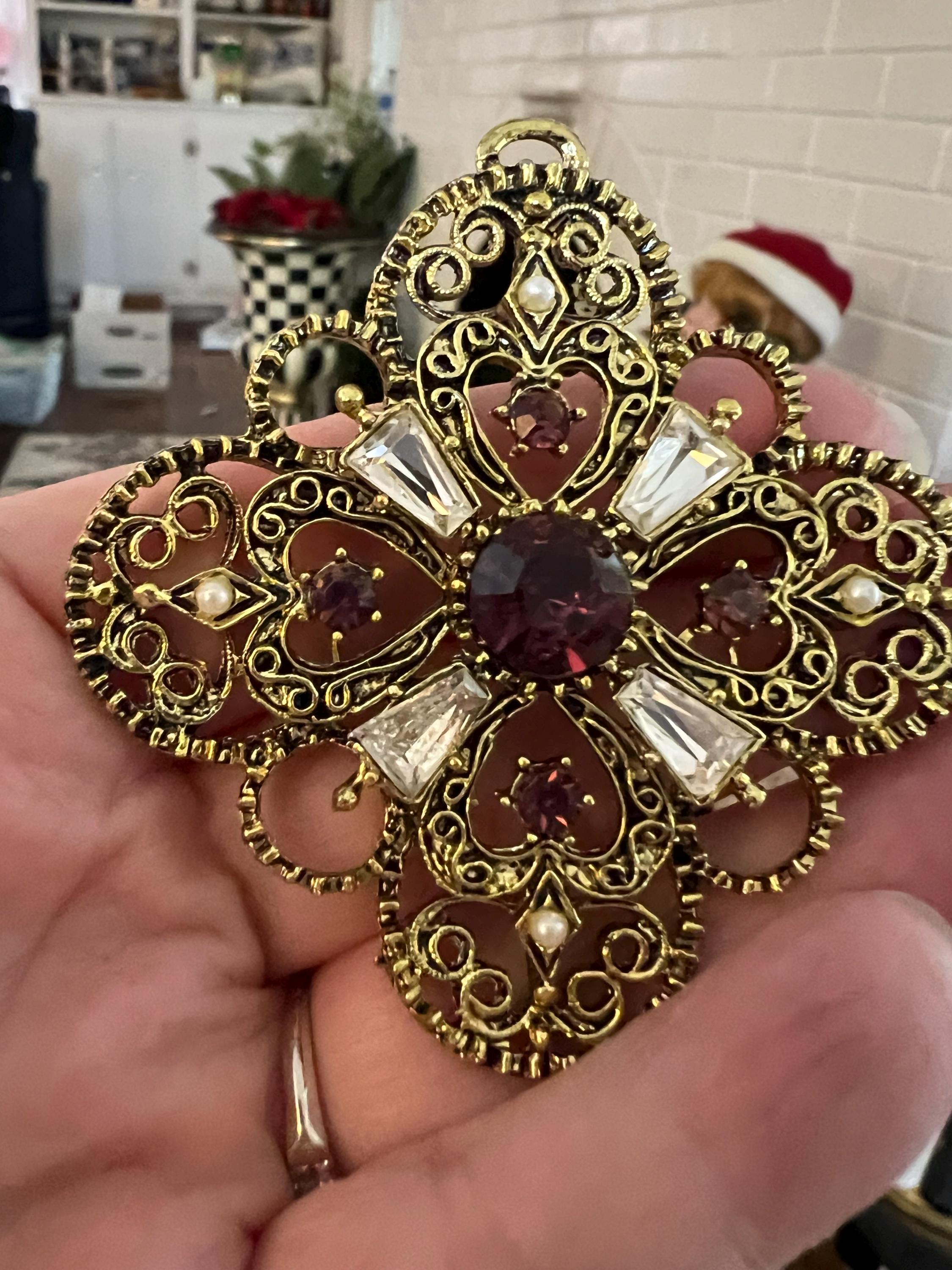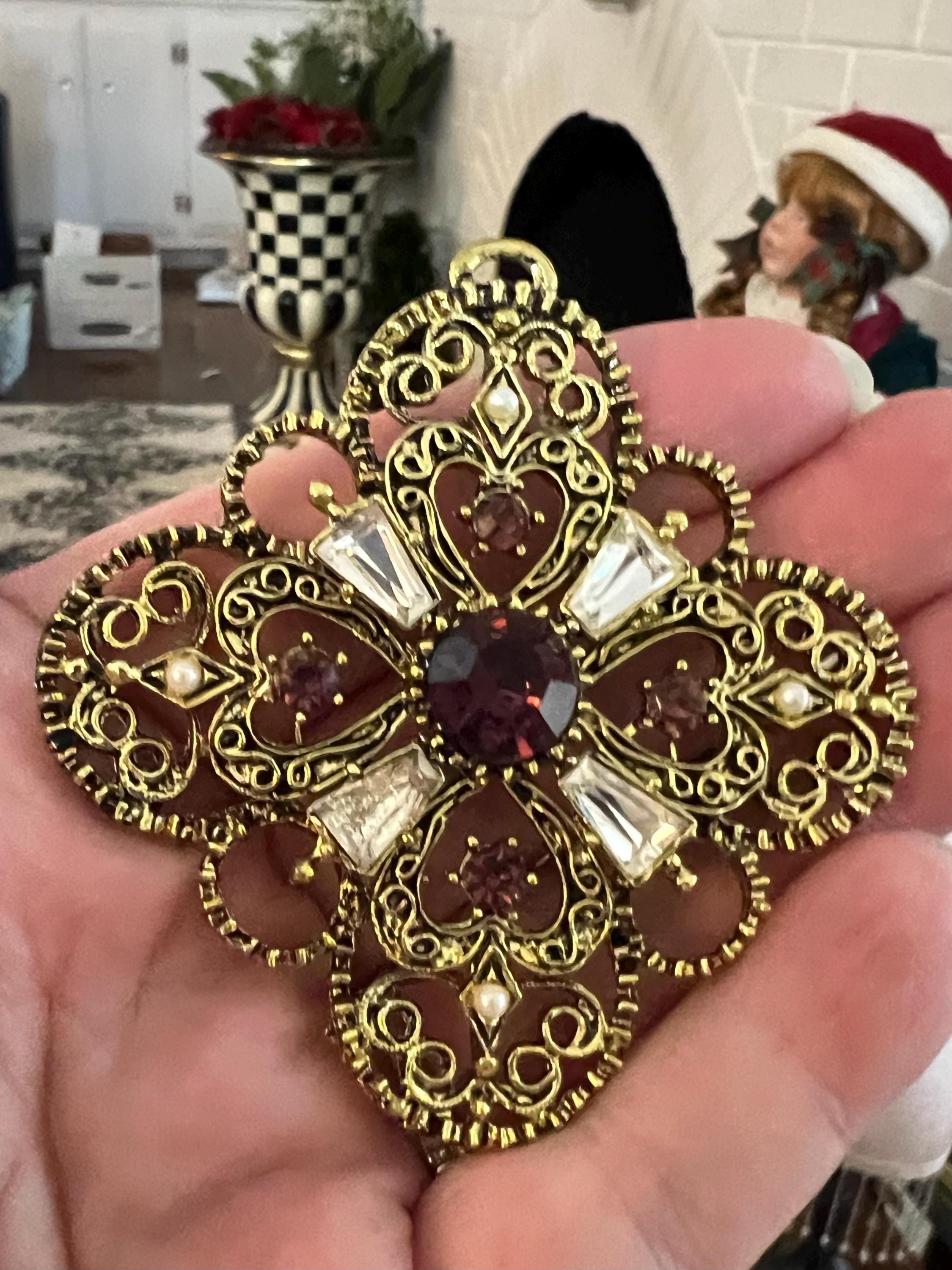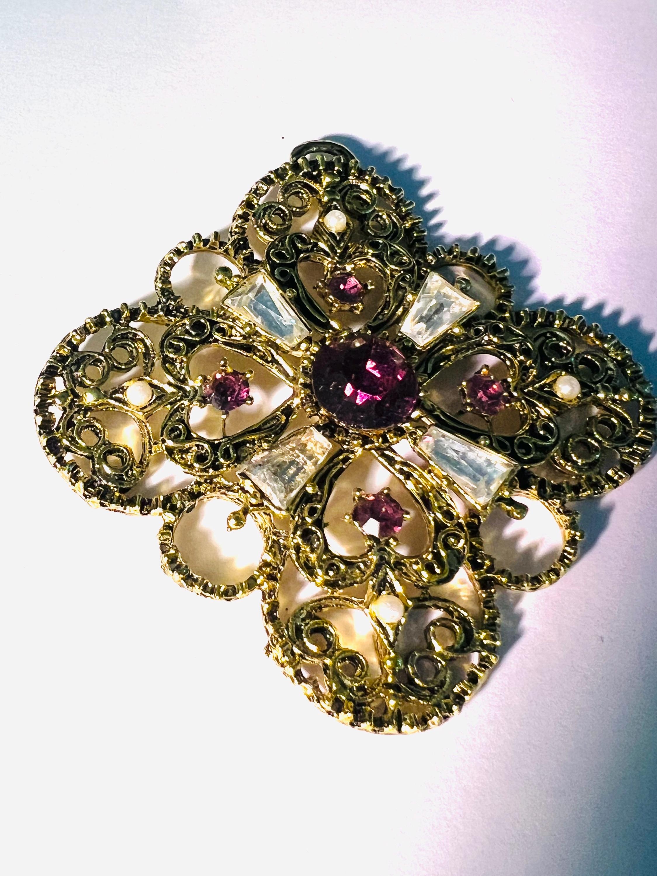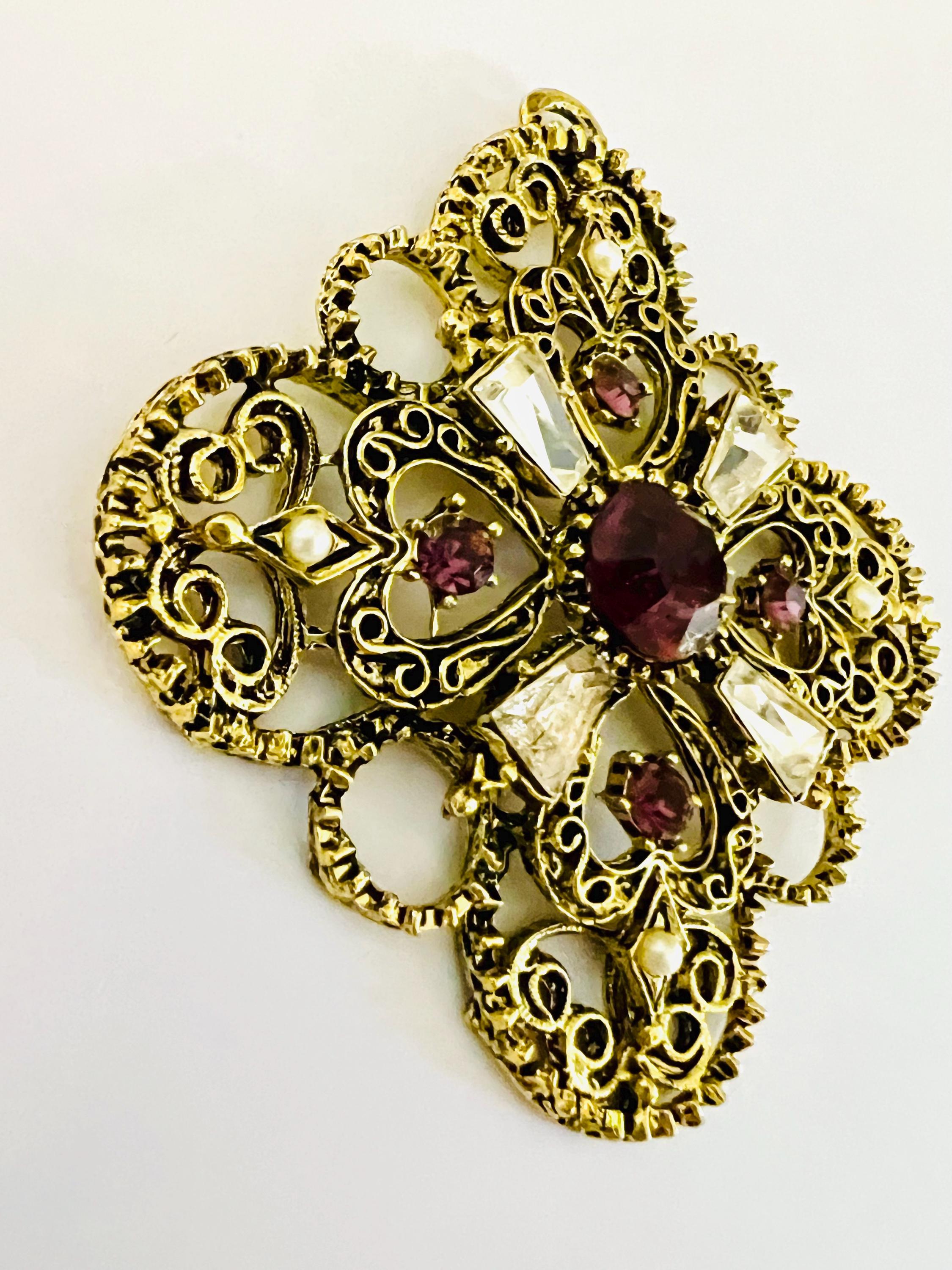 Large Victorian Revival Pendant: Fancy Antiqued Goldtone with Amethyst Rhinestones and Crystal Bagettes -DIY Necklace or Ornament