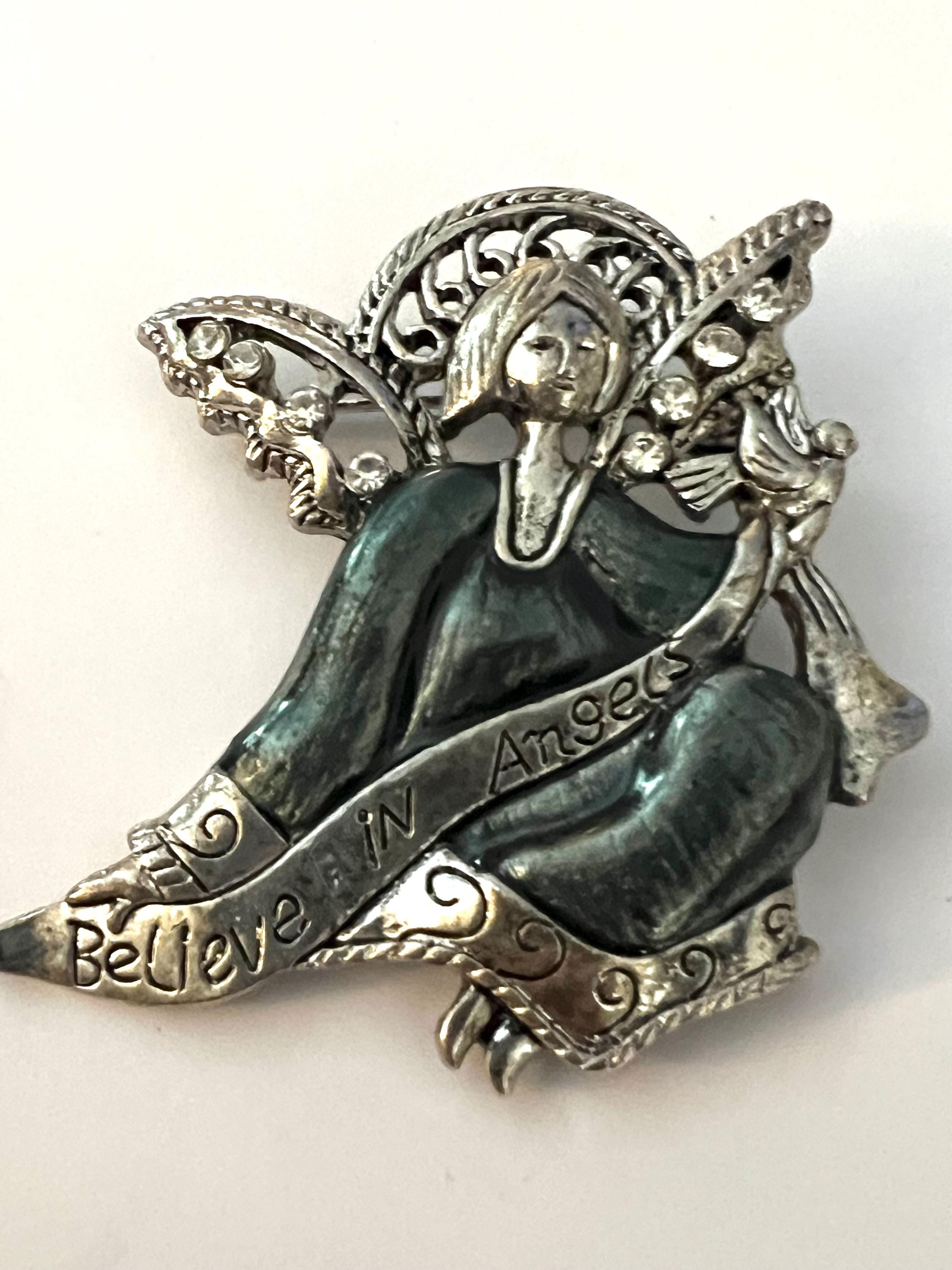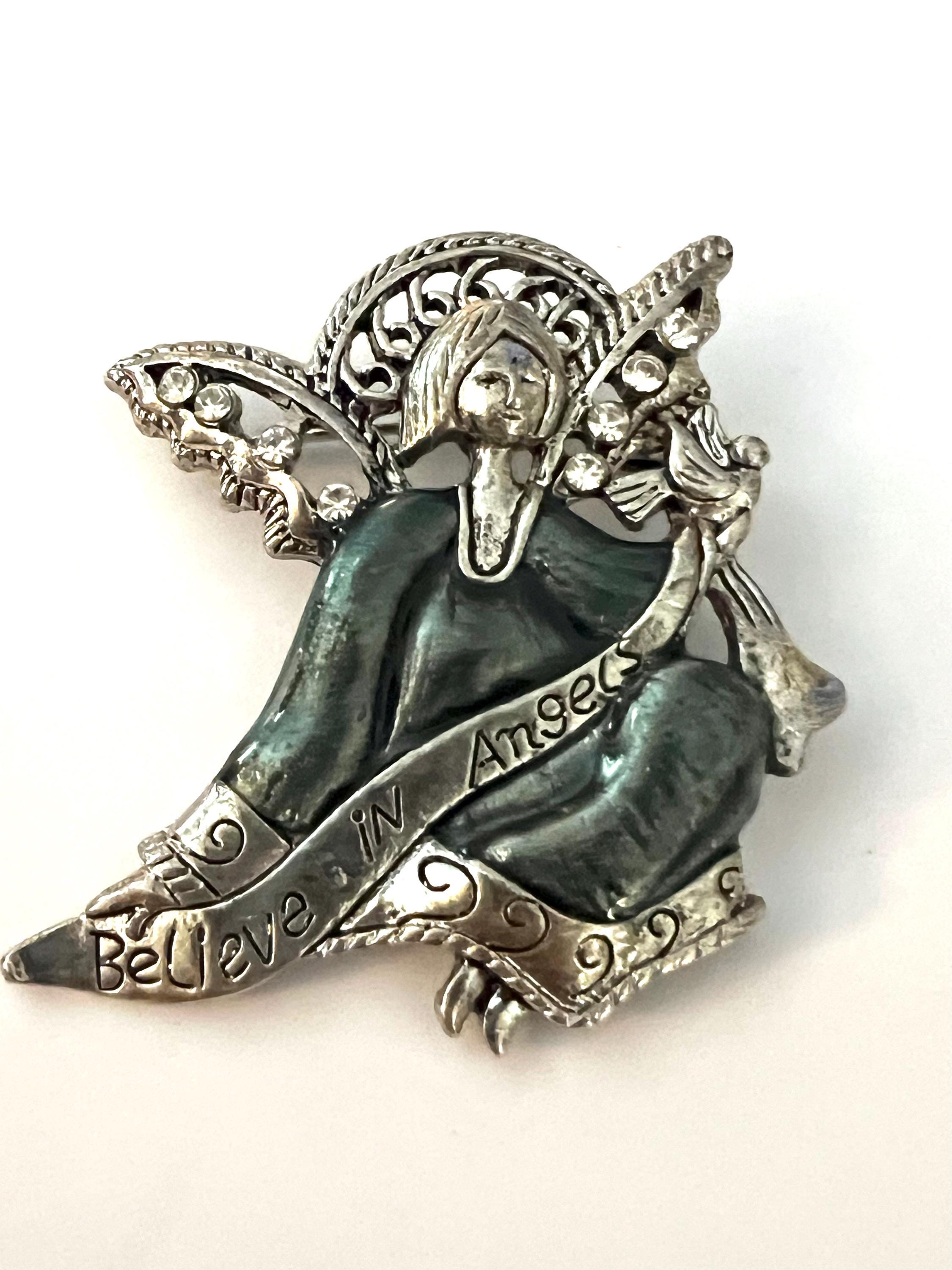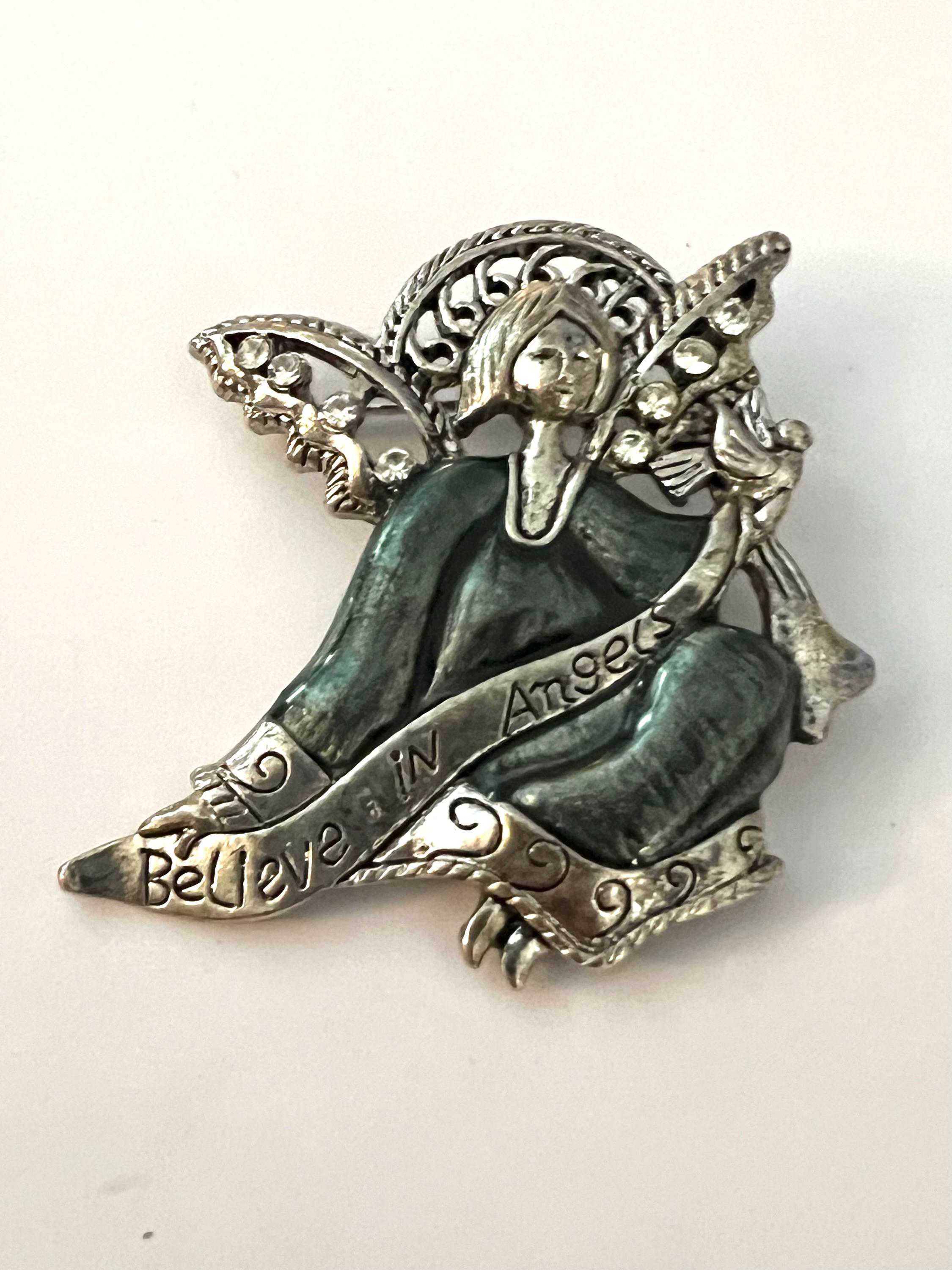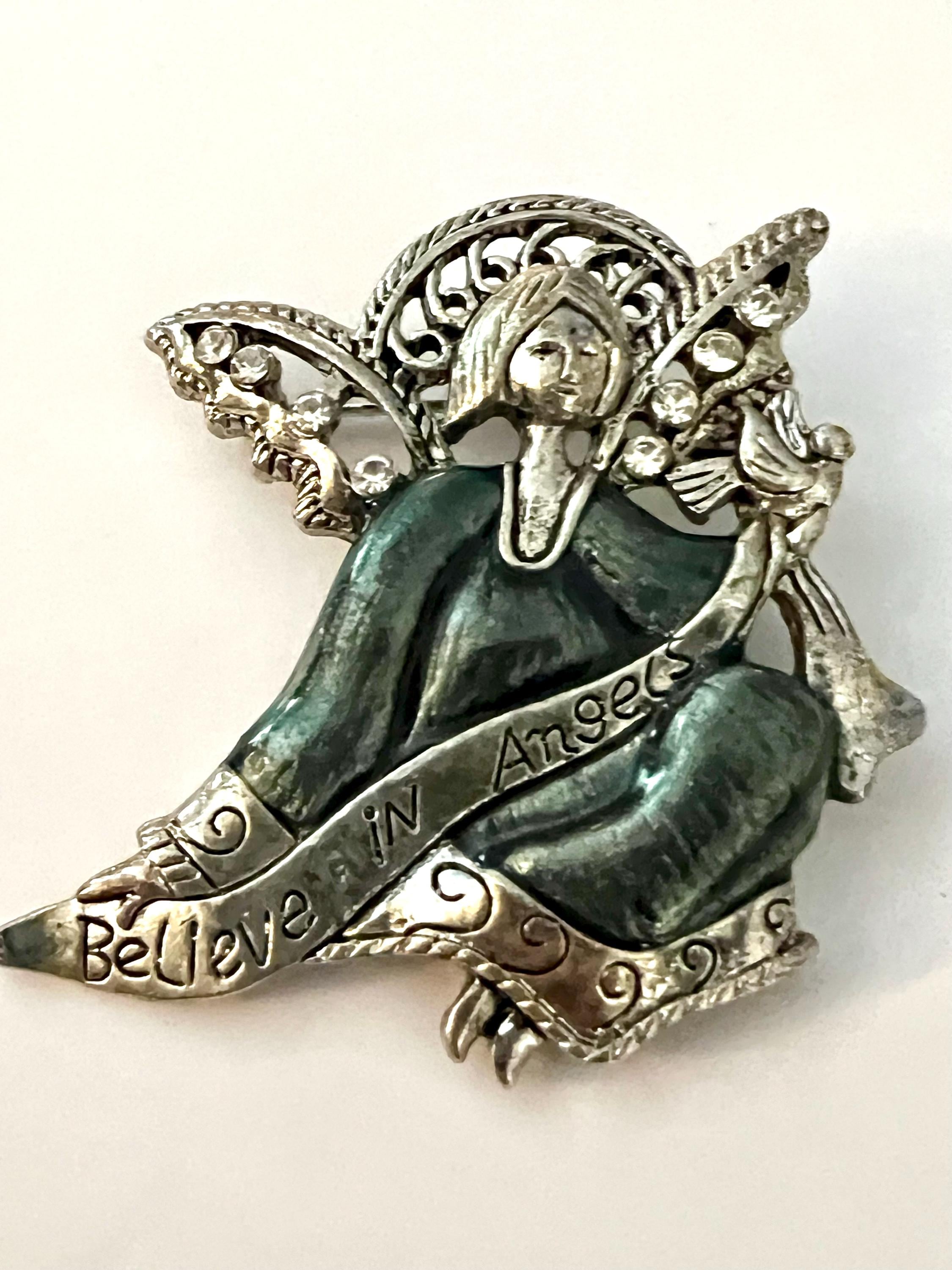 Vintage BELIEVE IN ANGELS Blue Enamel on Silver tone modern fairy like Angel with Butterfly like Openwork wings with ice crystal rhinestones