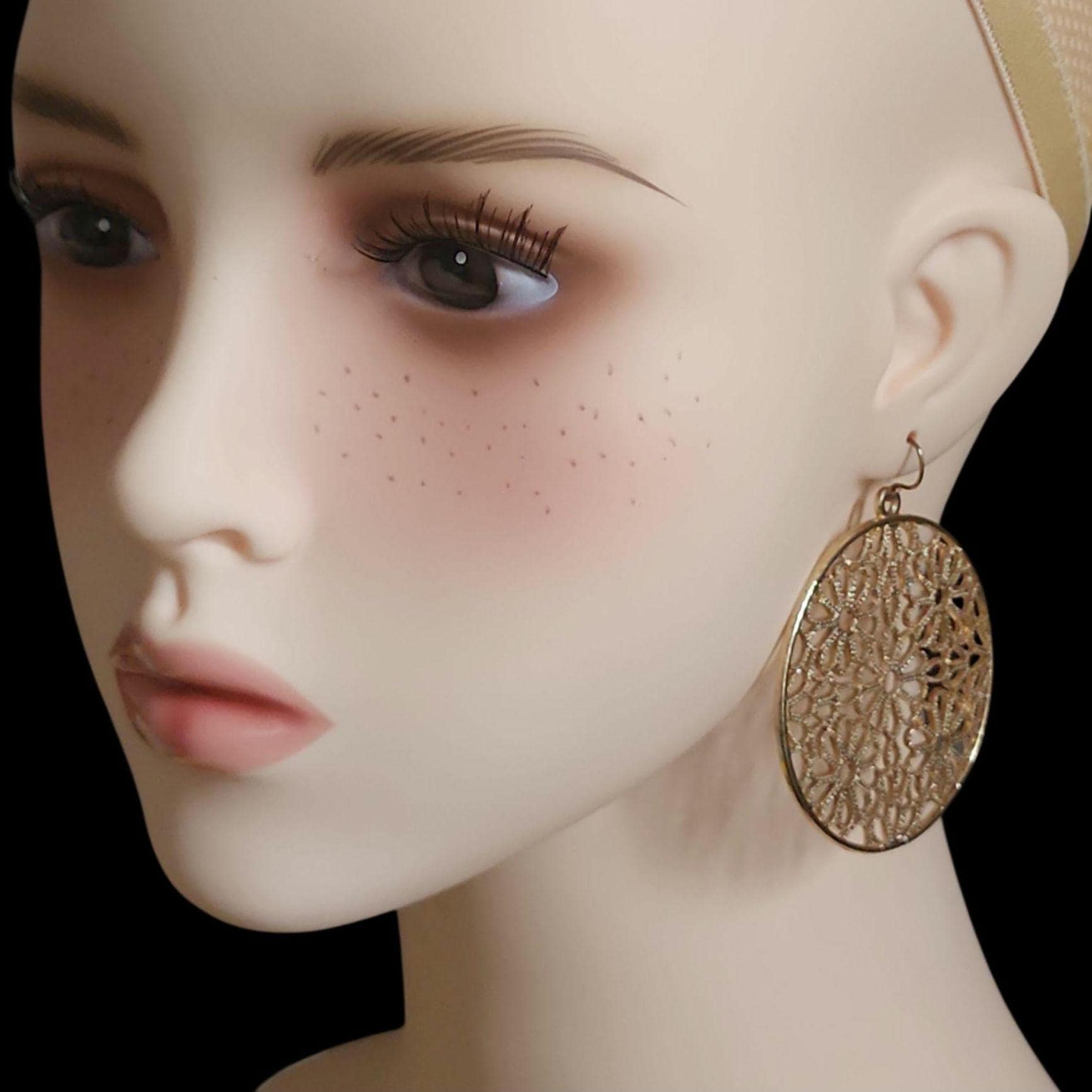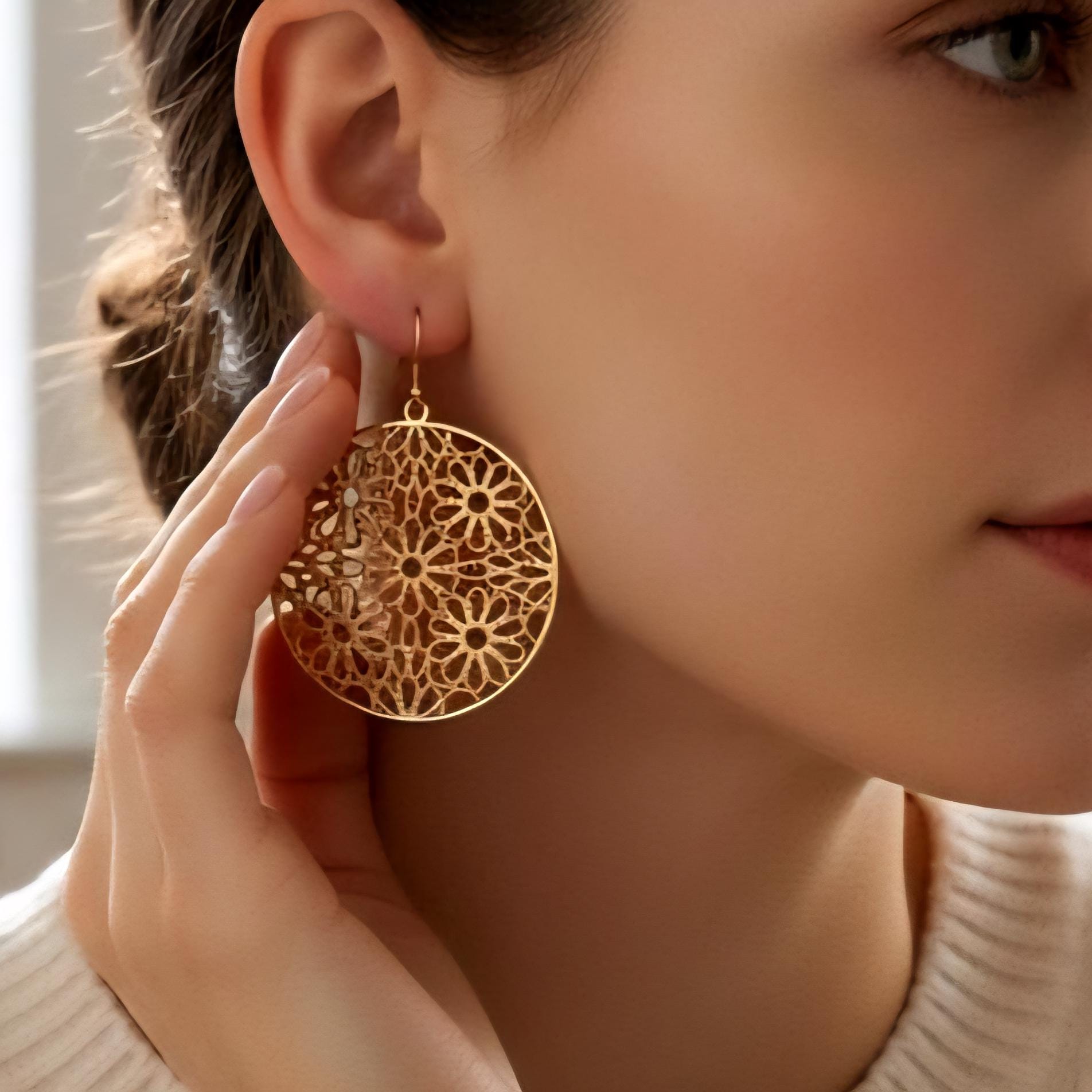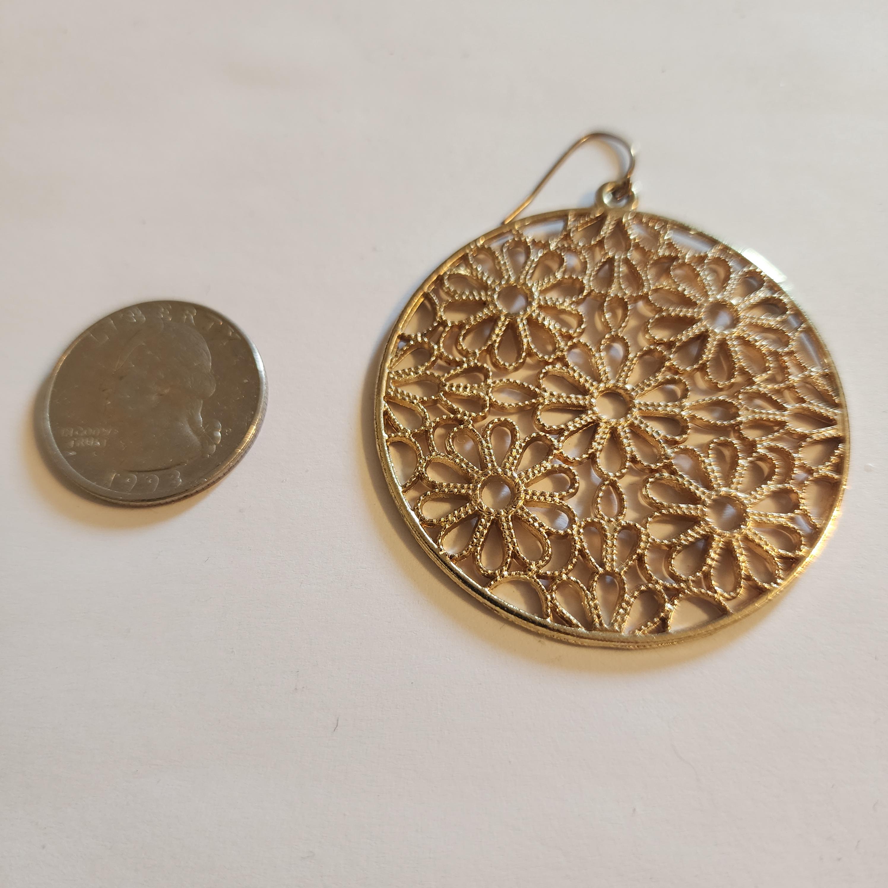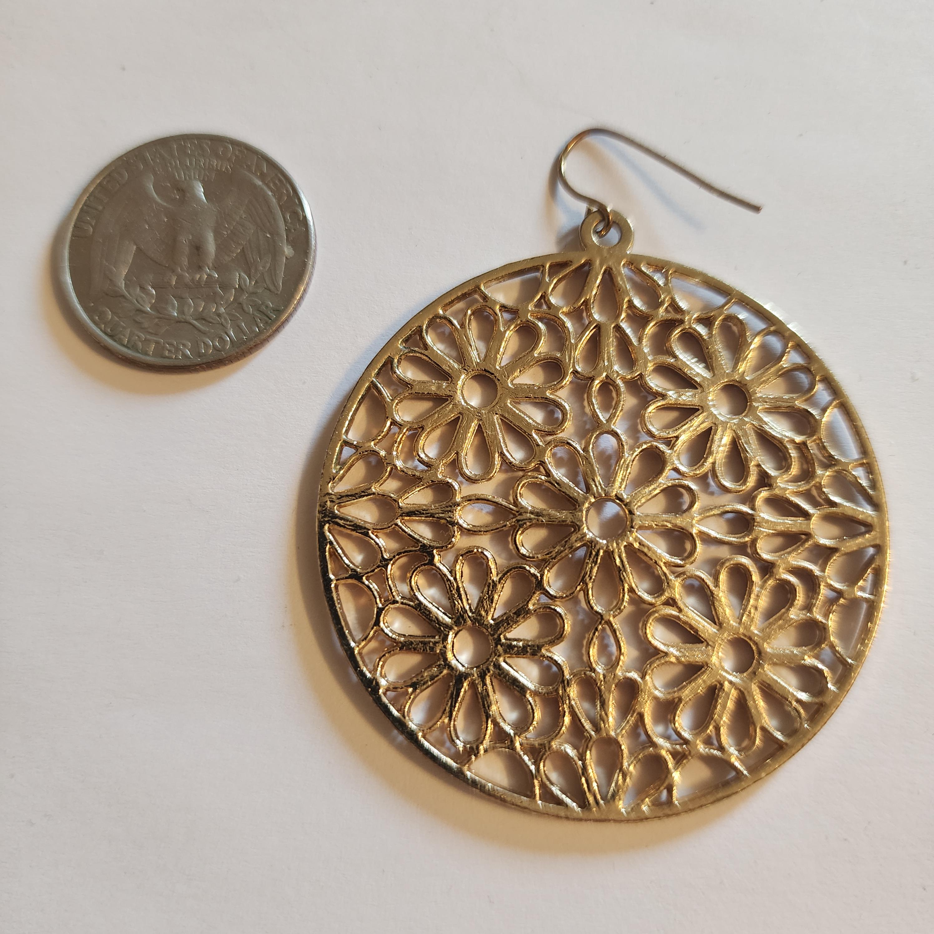 Dainty, Shiny Gold tone open work Daisy flower power disk dangle statement earrings. These whimsical earrings have a carefree free spirited quality while still being modest and elegant, making them easy to dress up or down too! chic with jeans or a casual floral frock or quite stylish with a simple black dress or sweater too!
