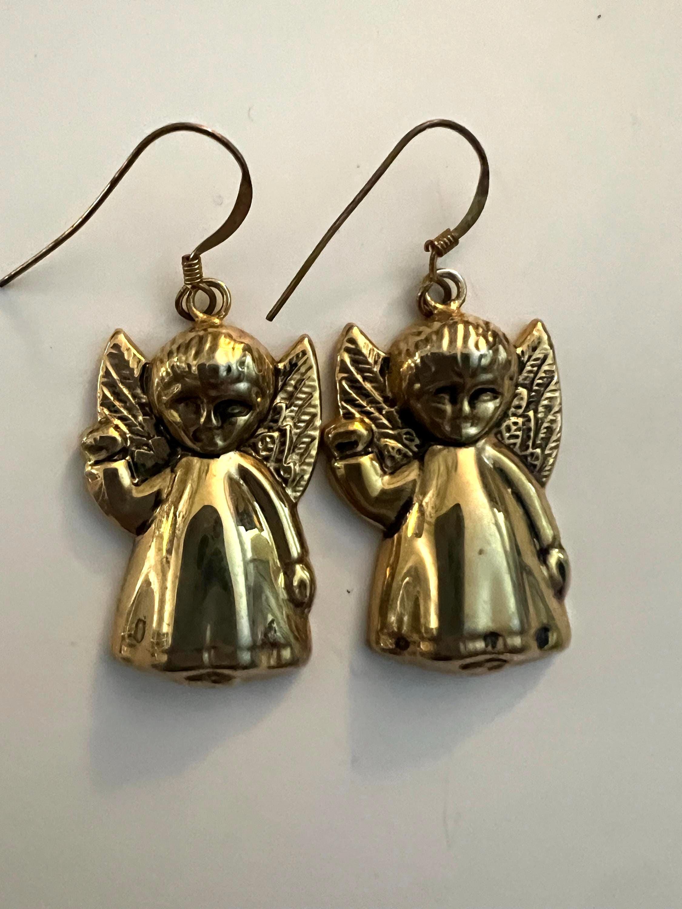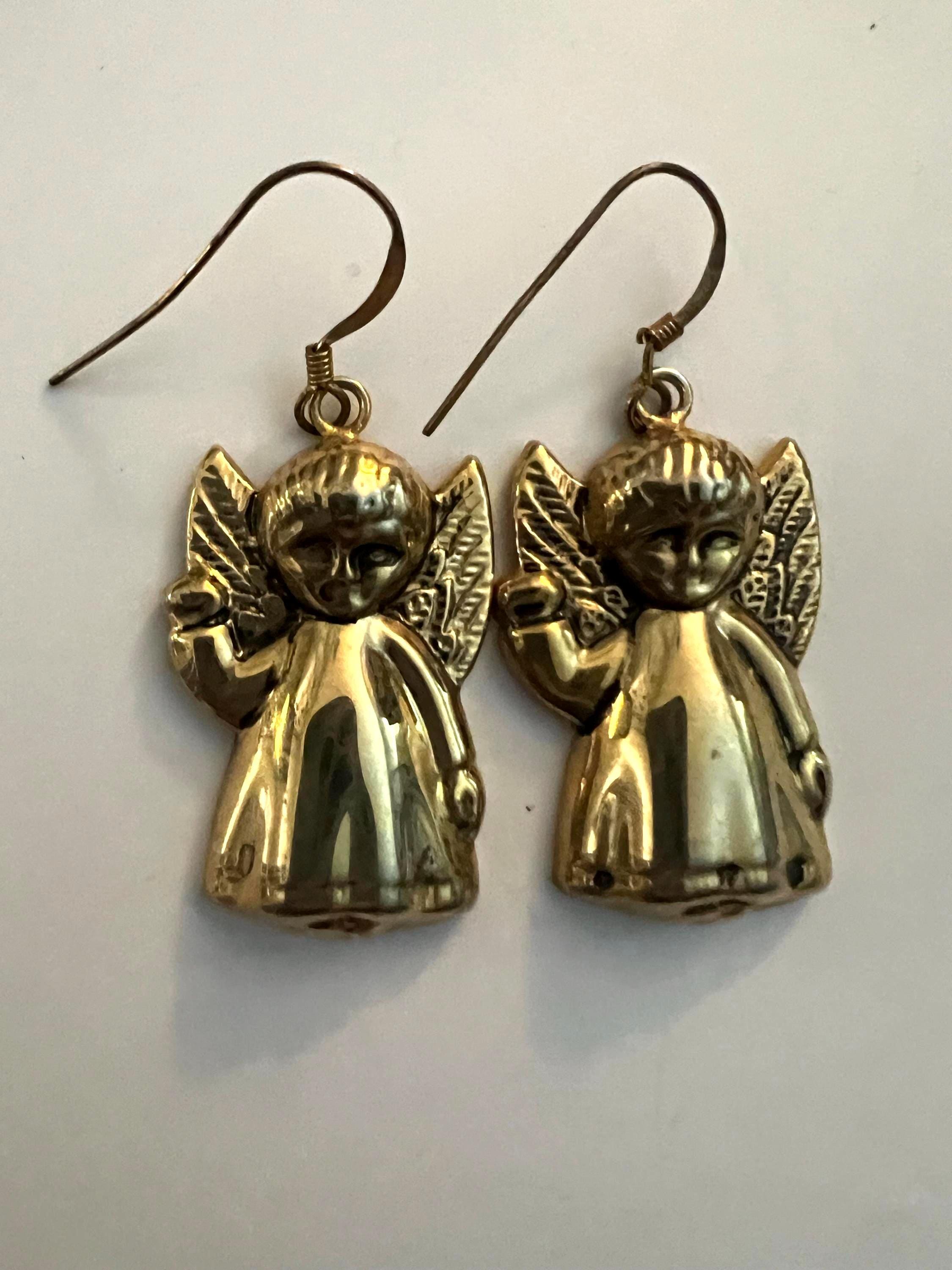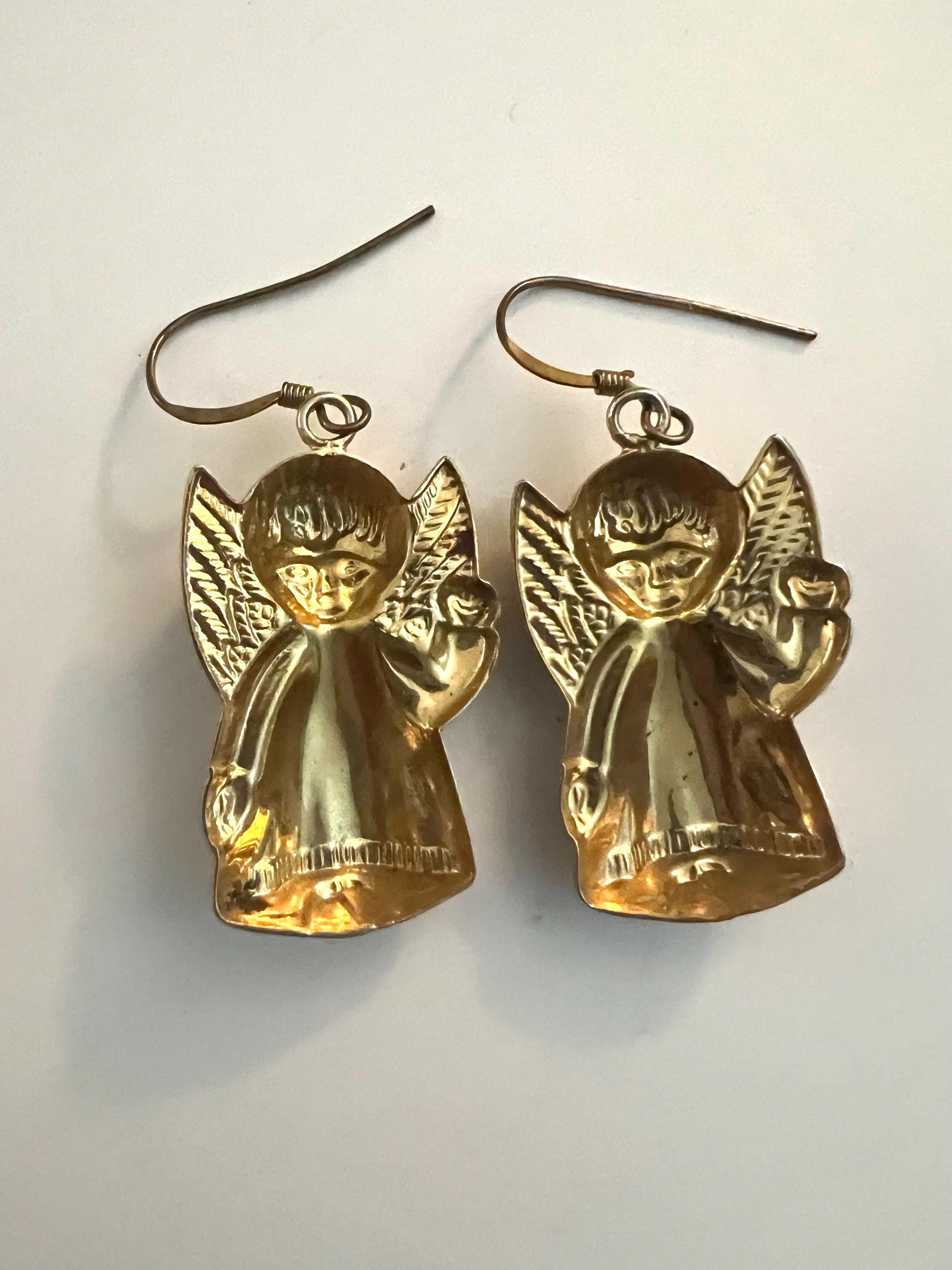 Cute Cottagecore Angel Dangle Earrings, late mid century pressed metal form collectible vintage jewelry