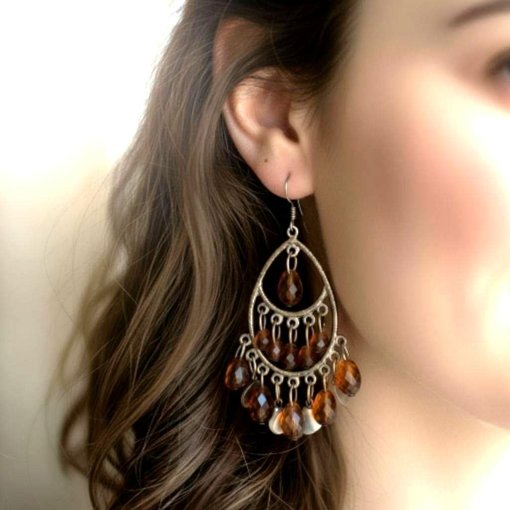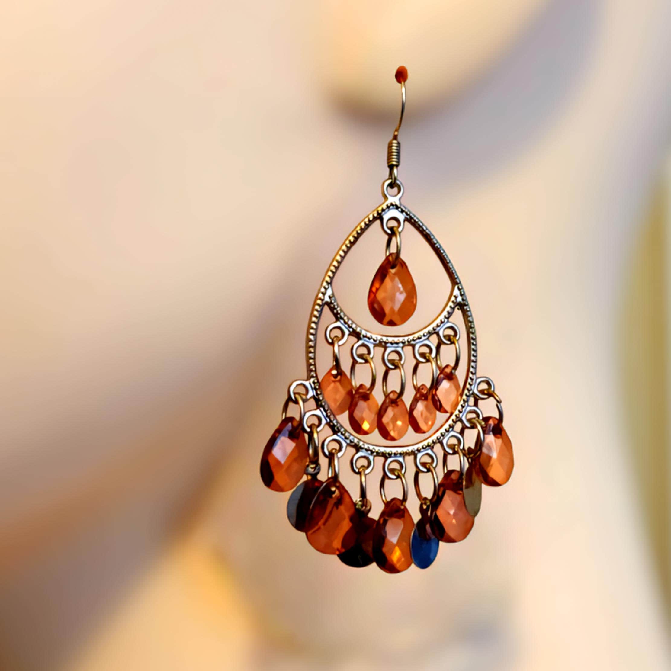 Vintage Y2K Colorful Dangles, Millennial Glamour Jewelry - this pair is a dark peachy coral amber chandelier style statement earrings - a lovely color for all seasons and pairs well with casual boho fashions as well as simple upscale casual separates or dresses. Perfect on vacation too! Nice fancy casual earrings!