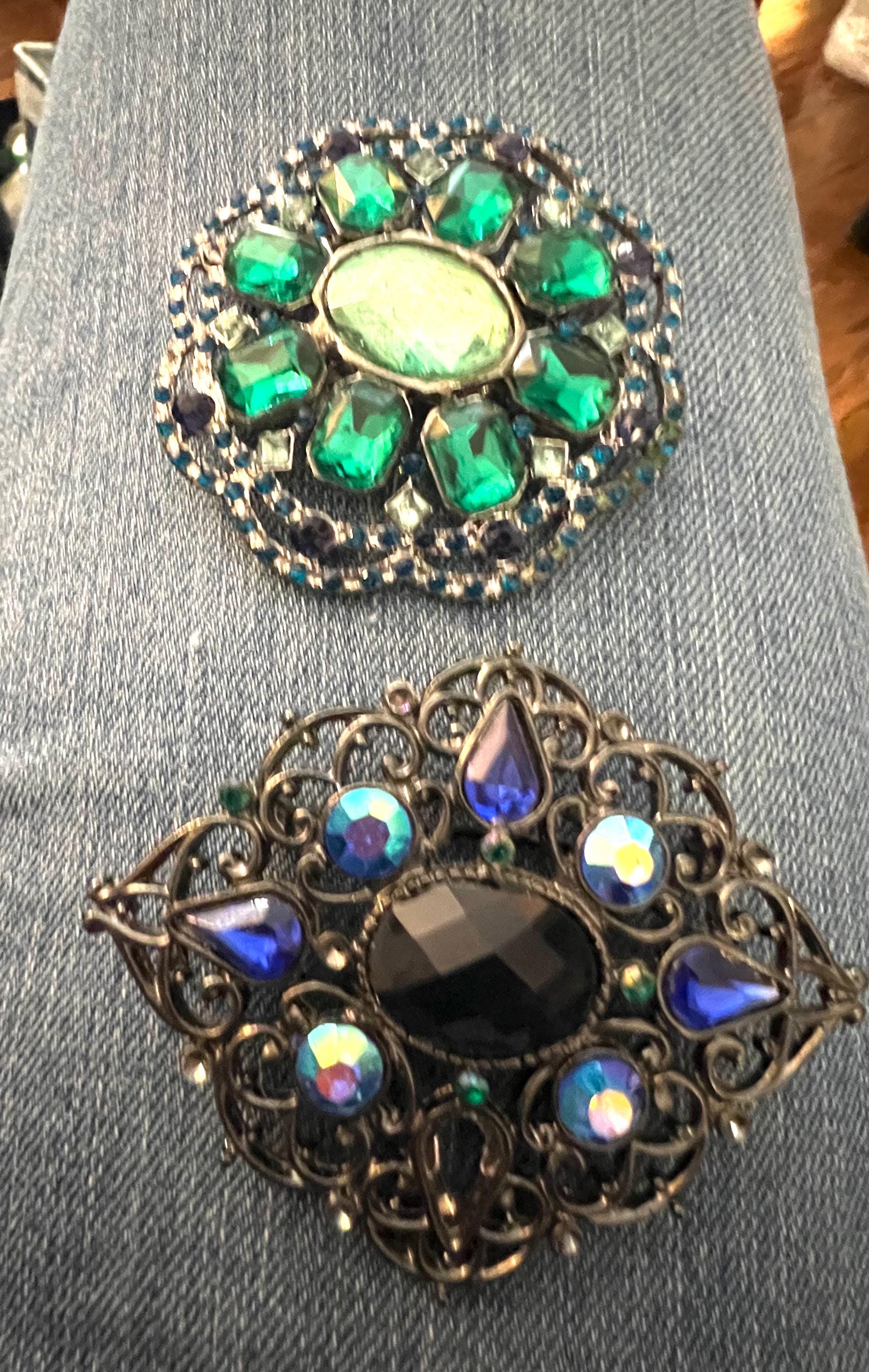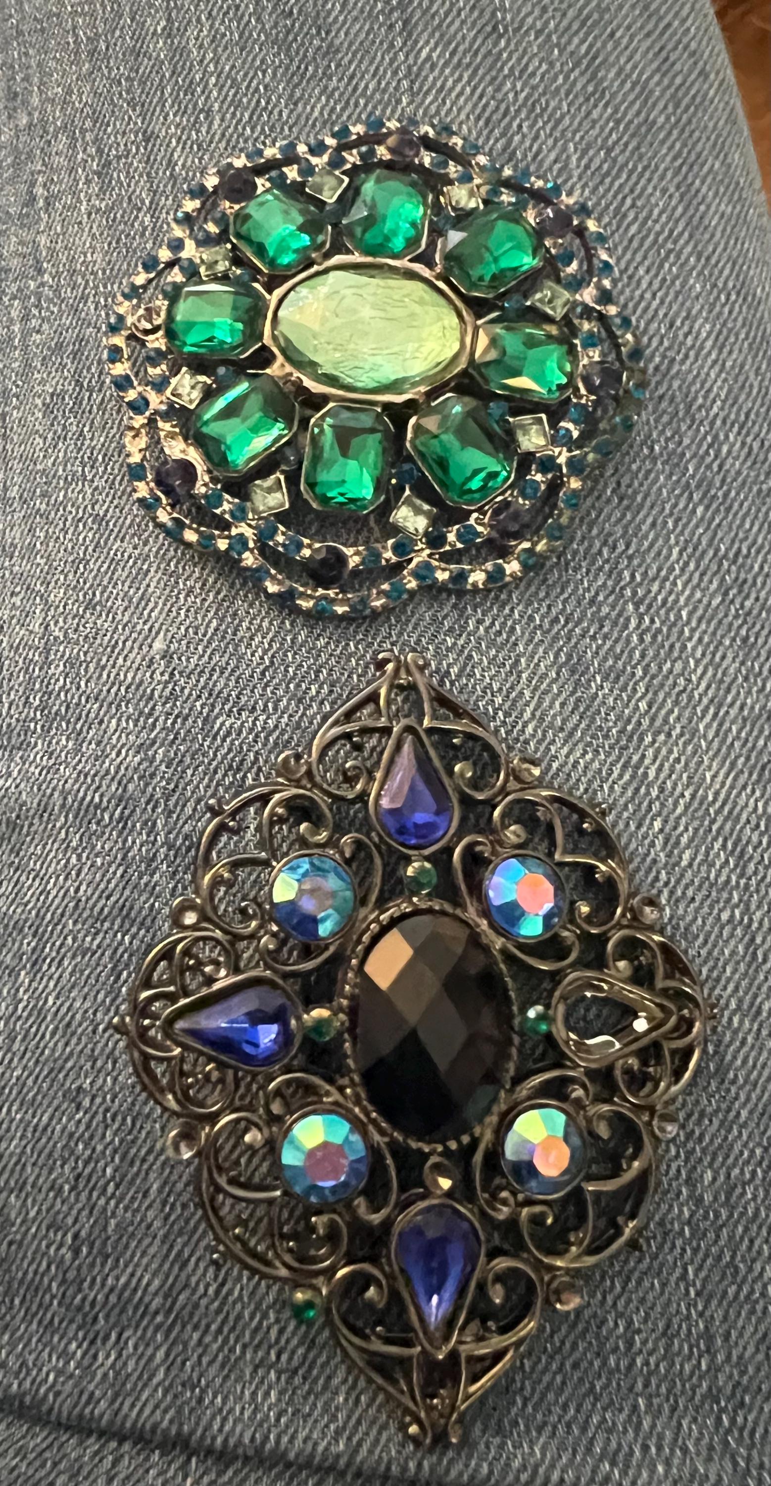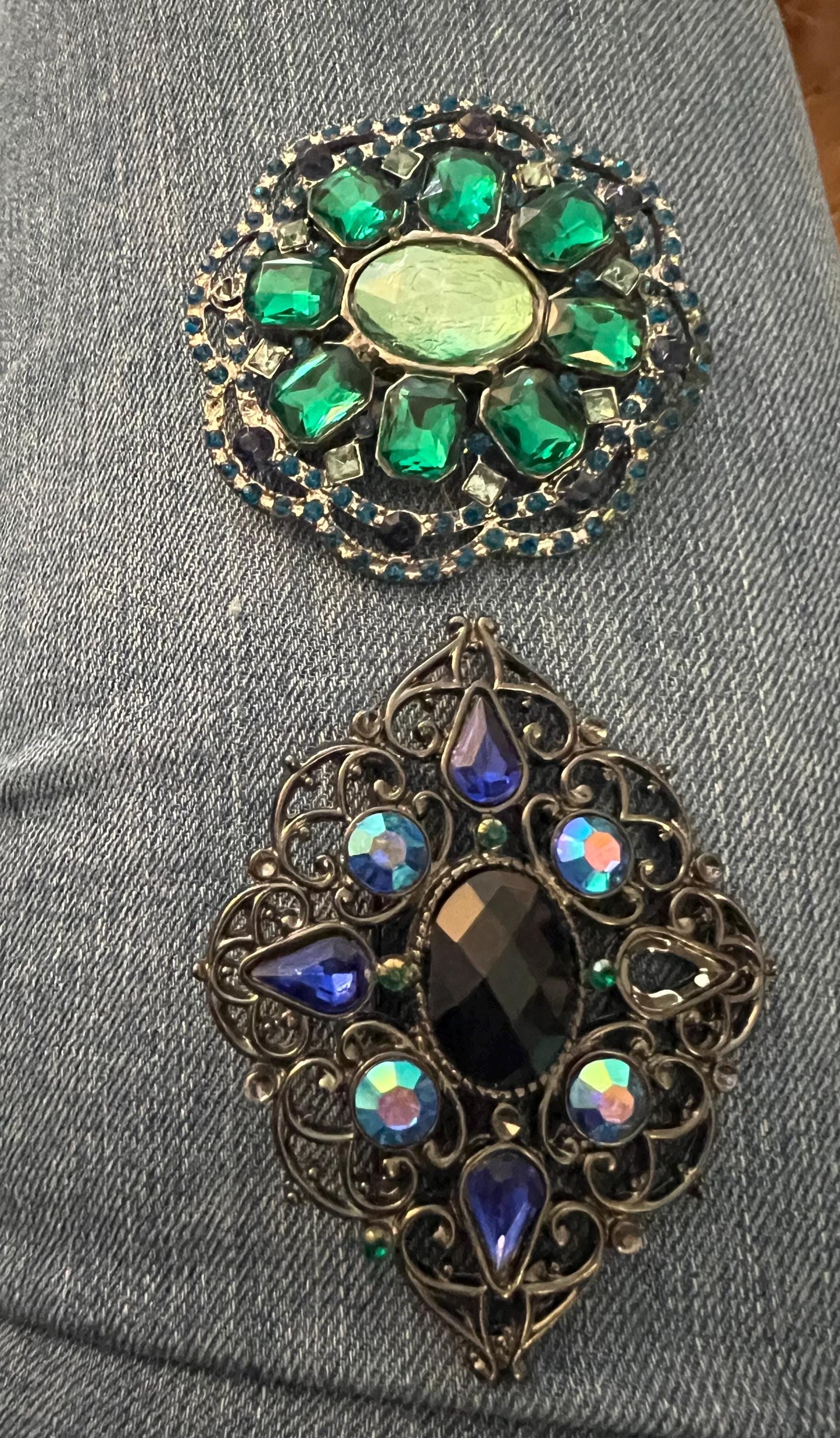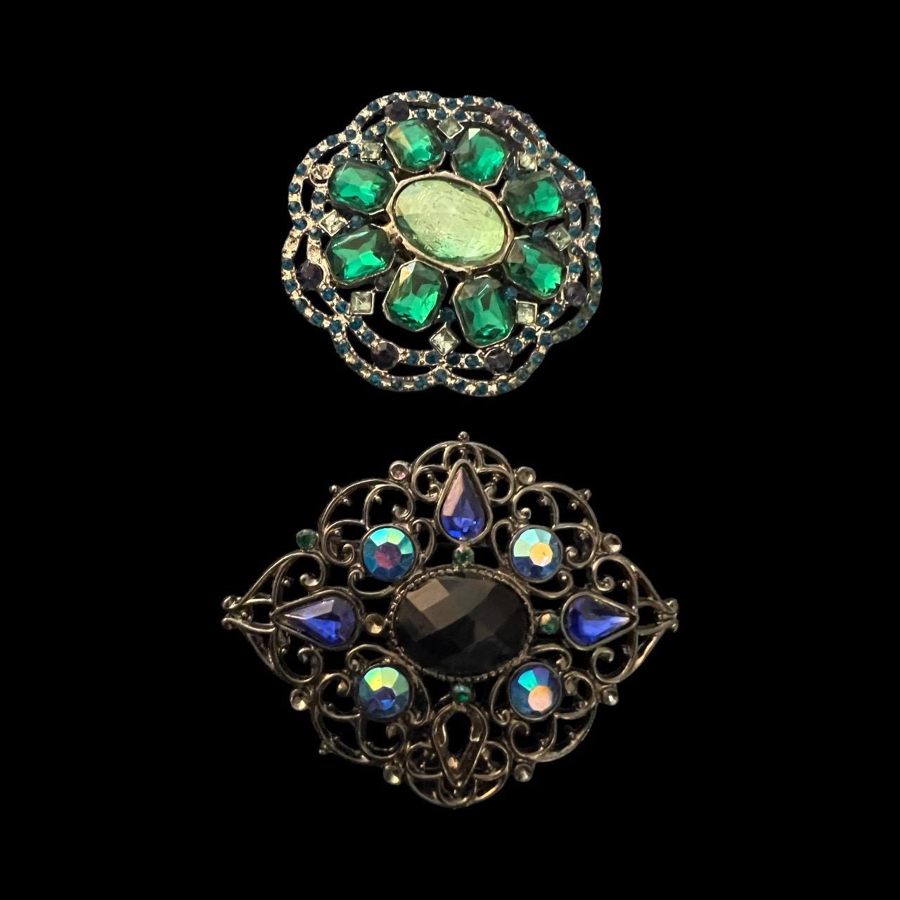 A Fun Pair of 2000 Glam sparkly Victorian Romantic Revival Blue and Green complimenting Lapel Pin Brooches