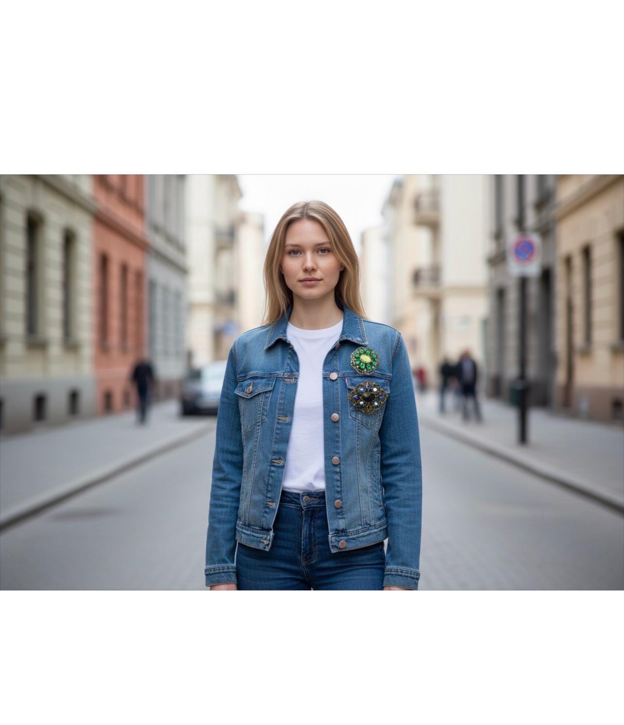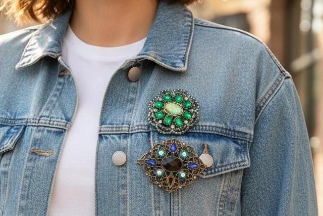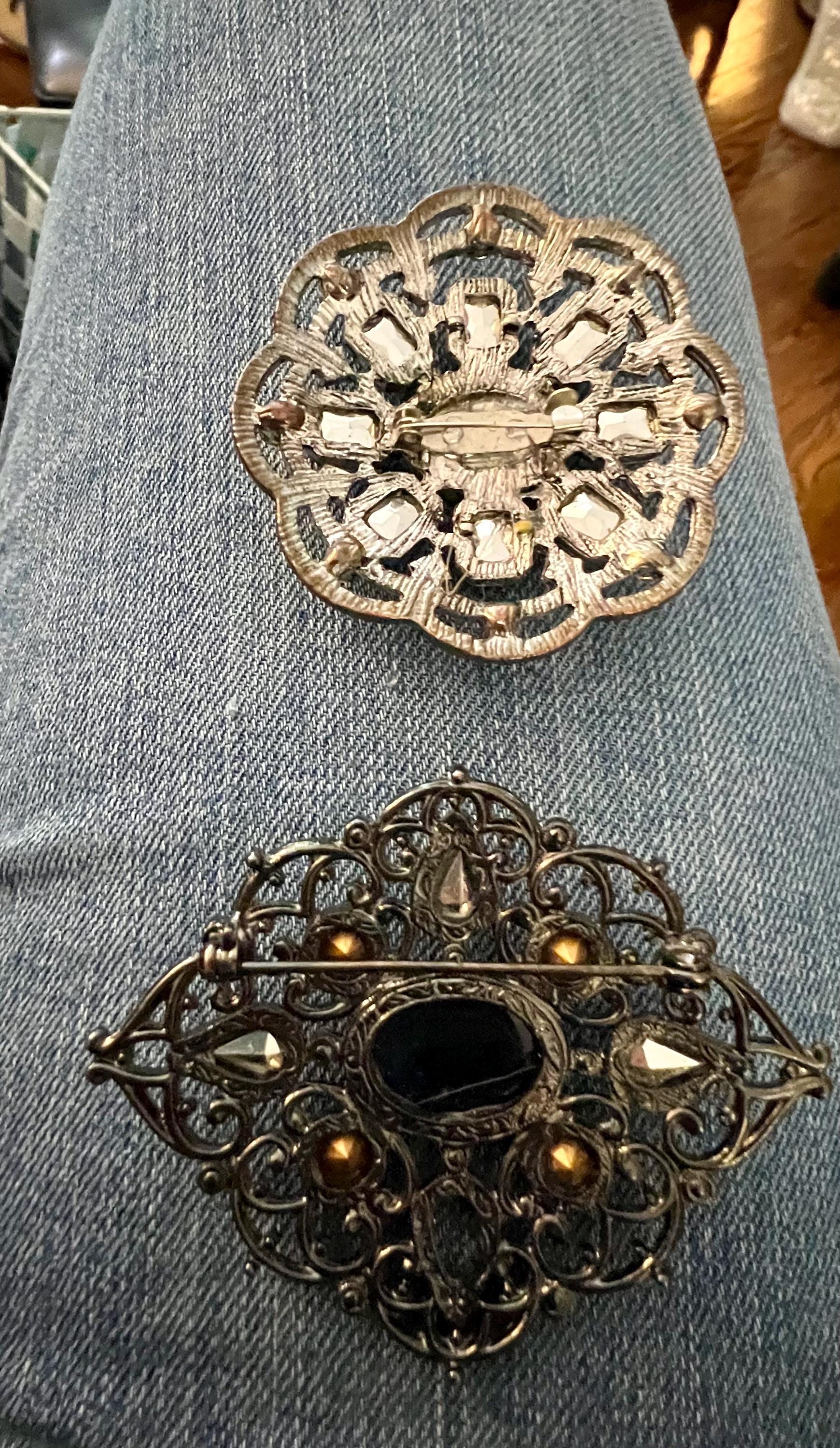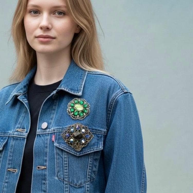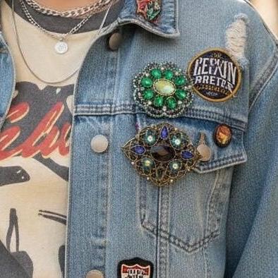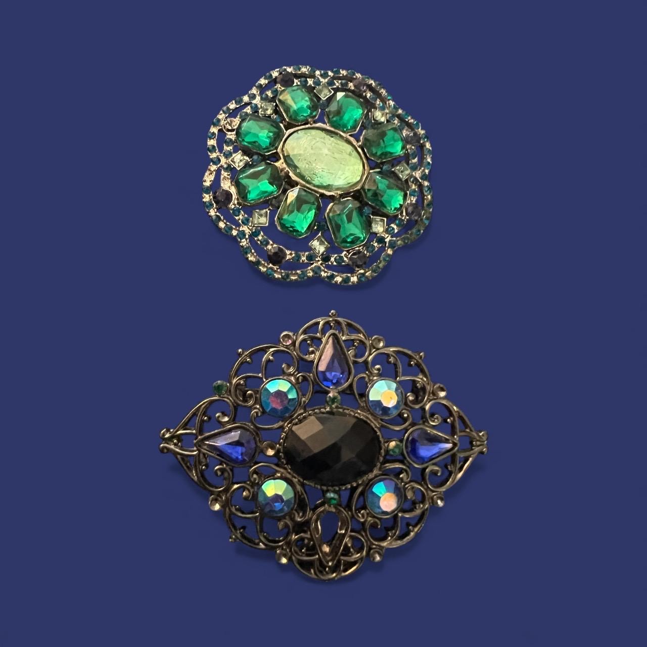 A Fun Pair of 2000 Glam sparkly Victorian Romantic Revival Blue and Green complimenting Lapel Pin Brooches