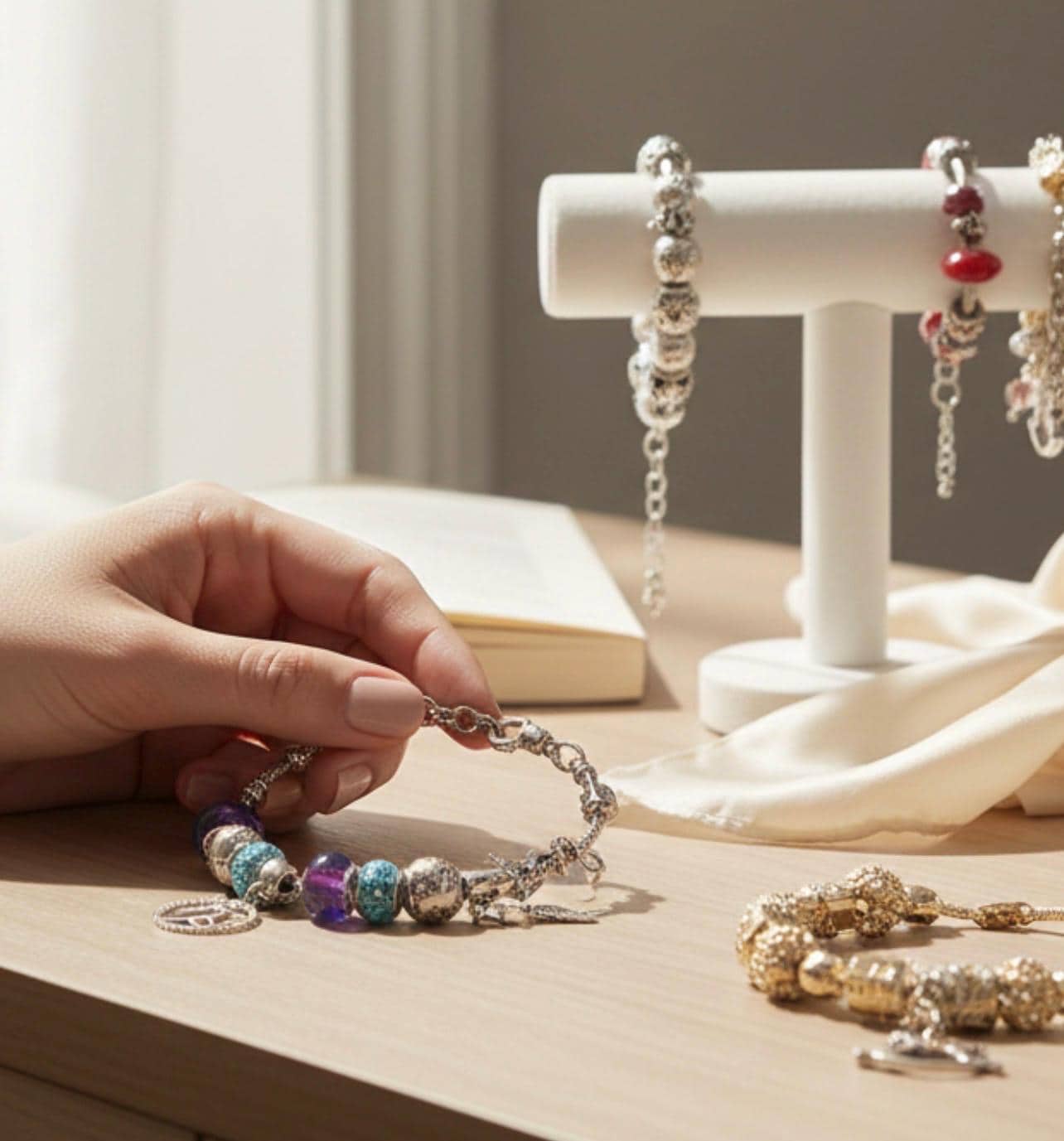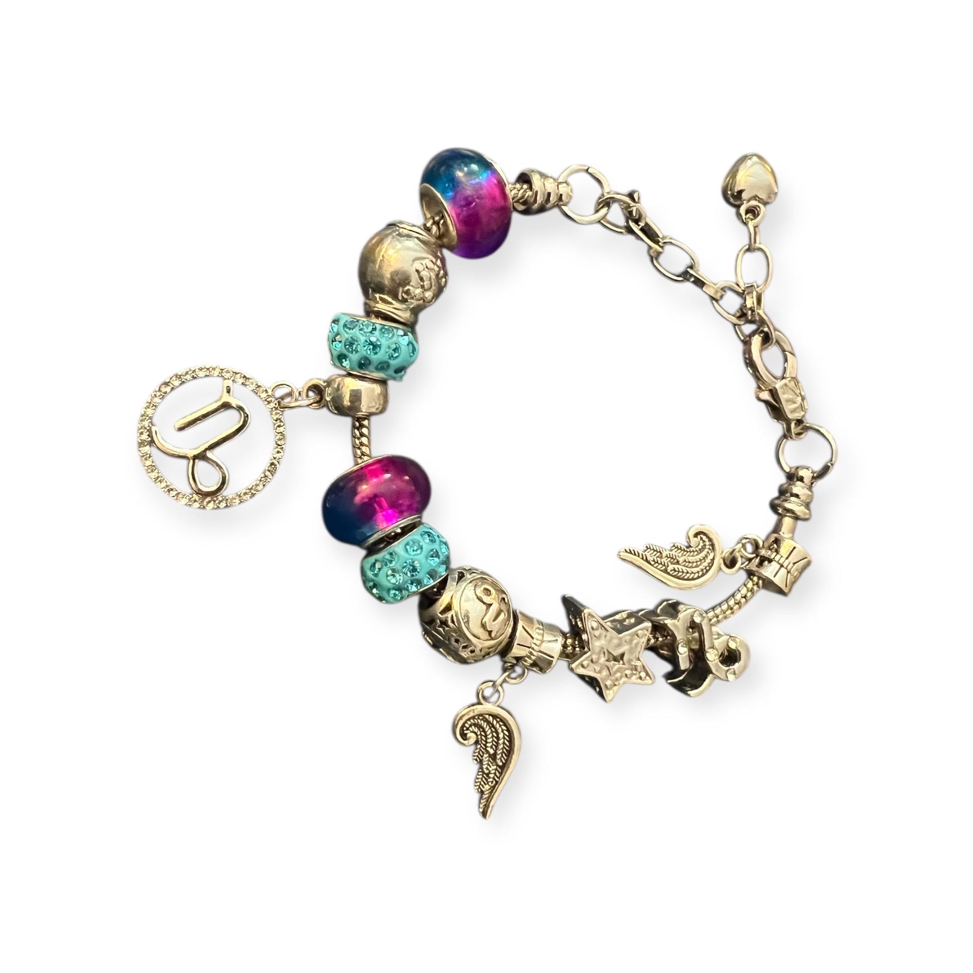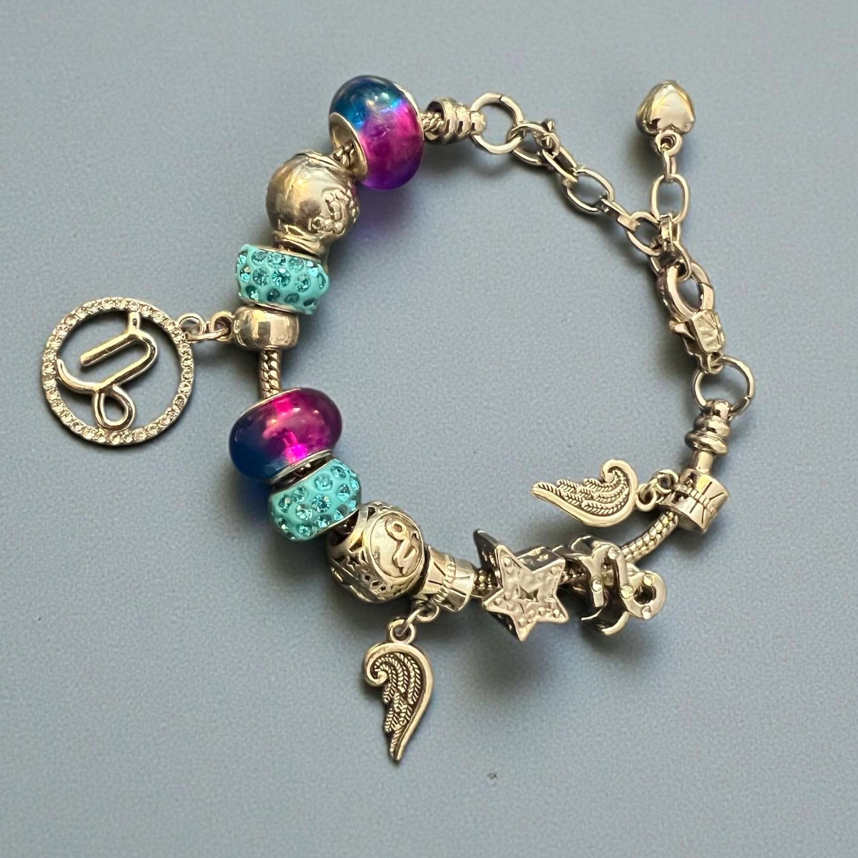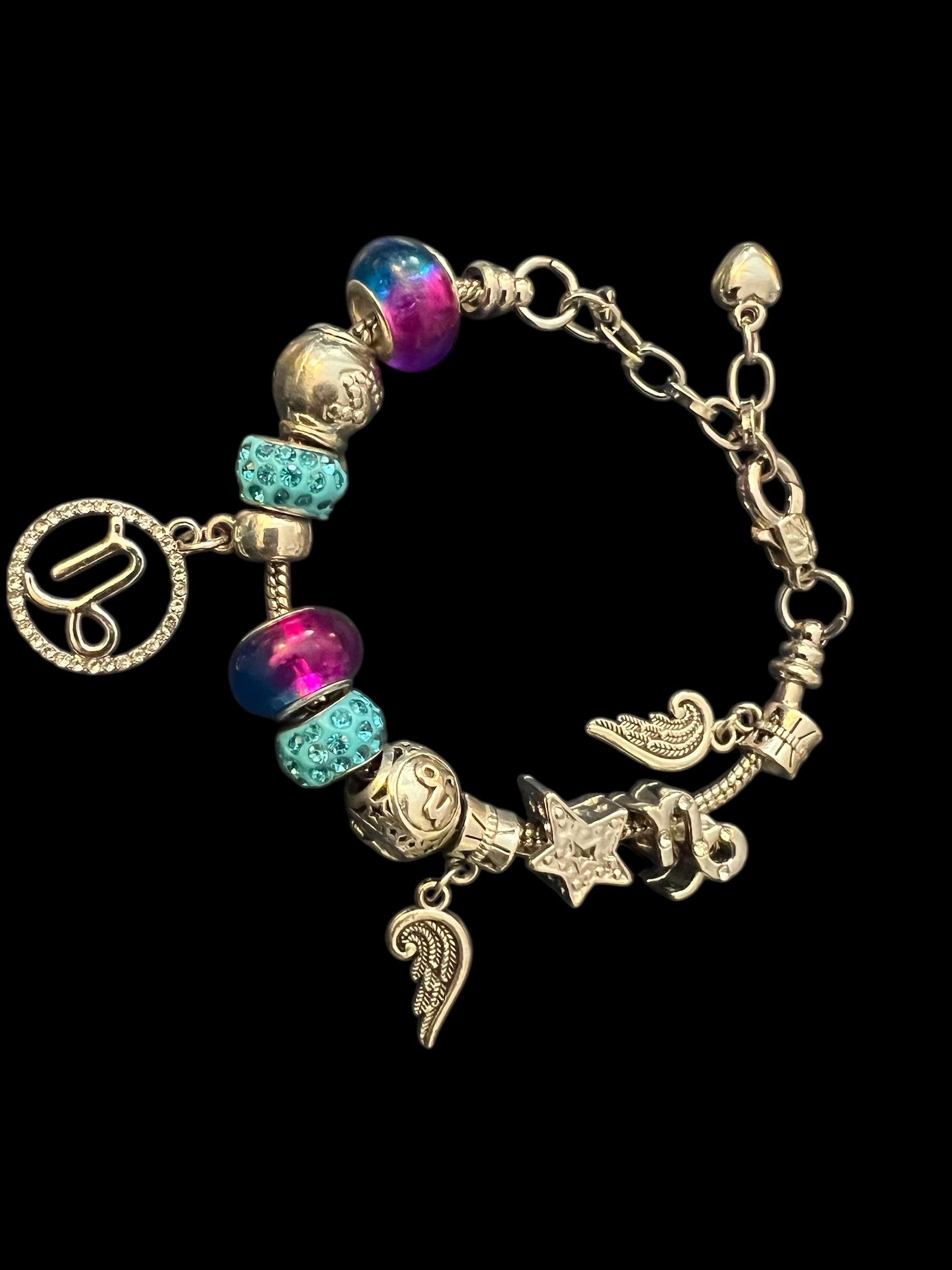 Colorful Y2K Charm Bracelet: Purple Beads, Angel Wings, and Capicorn Zodiac Charms on snake chain charm holder with fastener that opens and closes not only to allow you to place the bracelet into one’s wrist, it also allows you to add or change your beads or charm themes or color scheme. super fun, cool and not your mother’s!