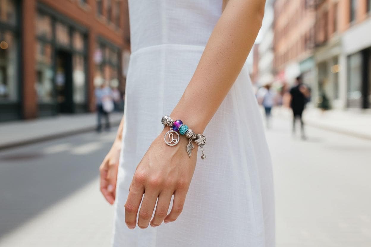 Y2K Charm Bracelet: Purple Beads, Angel Wings, Capricorn Zodiac
