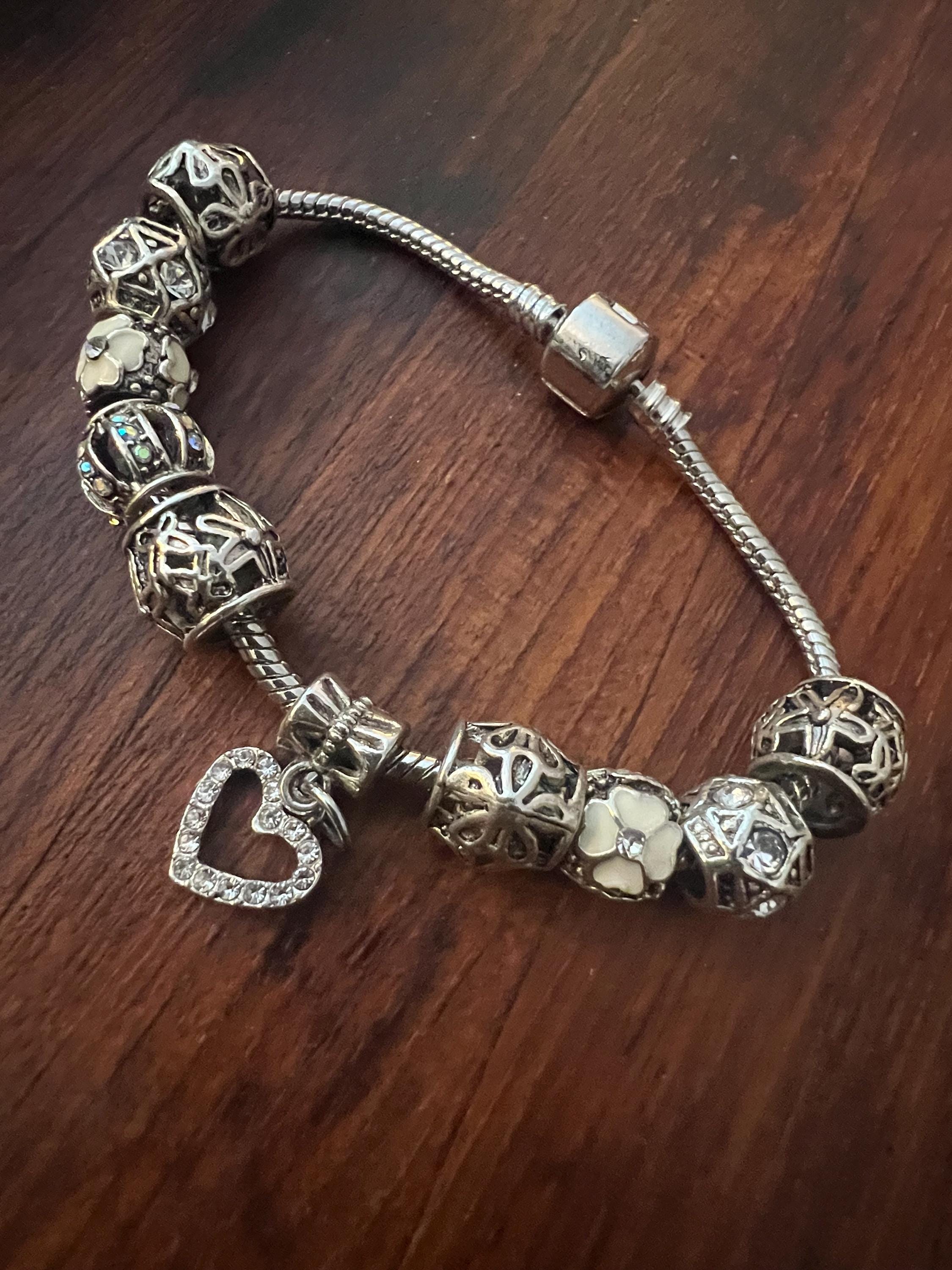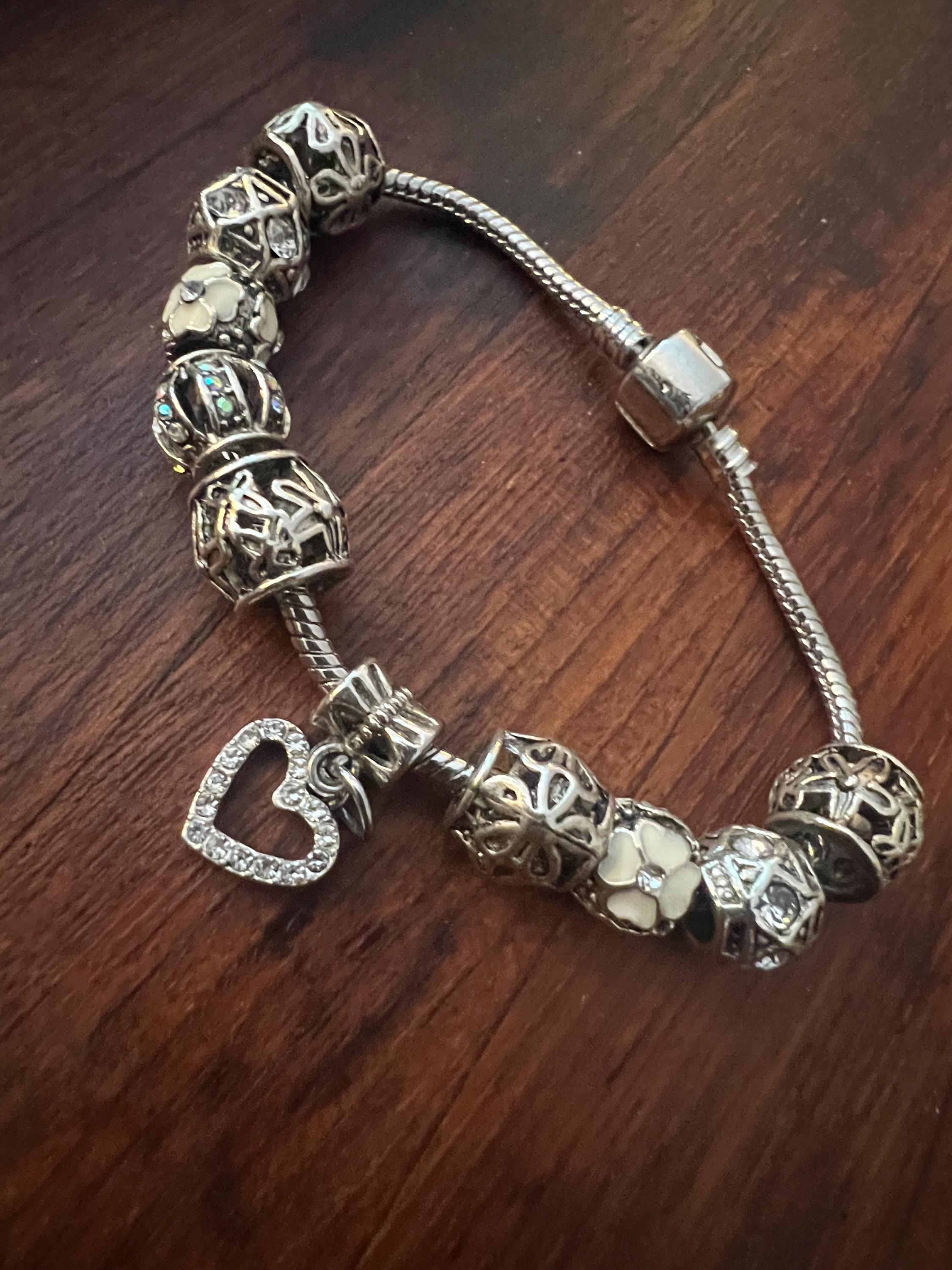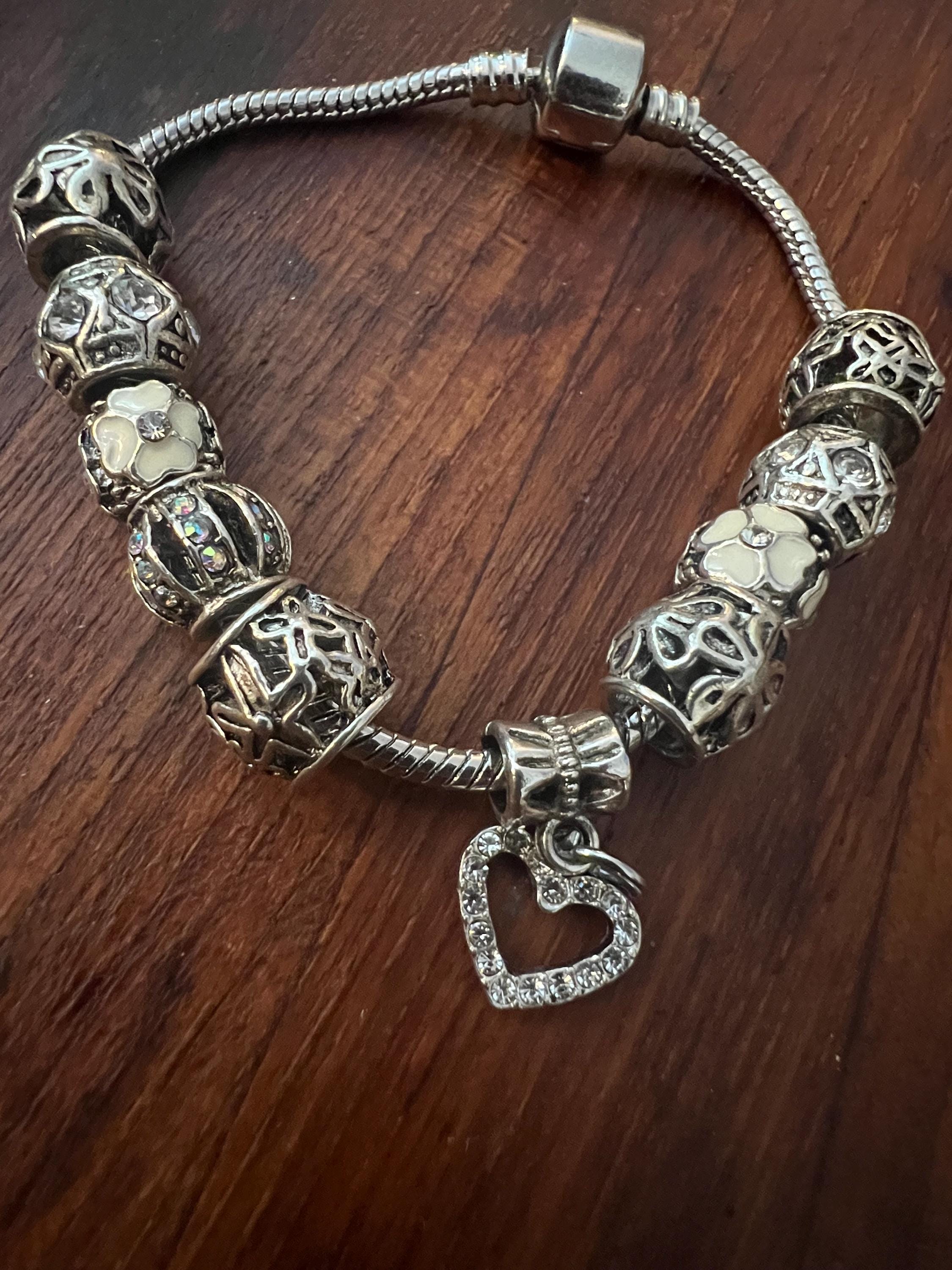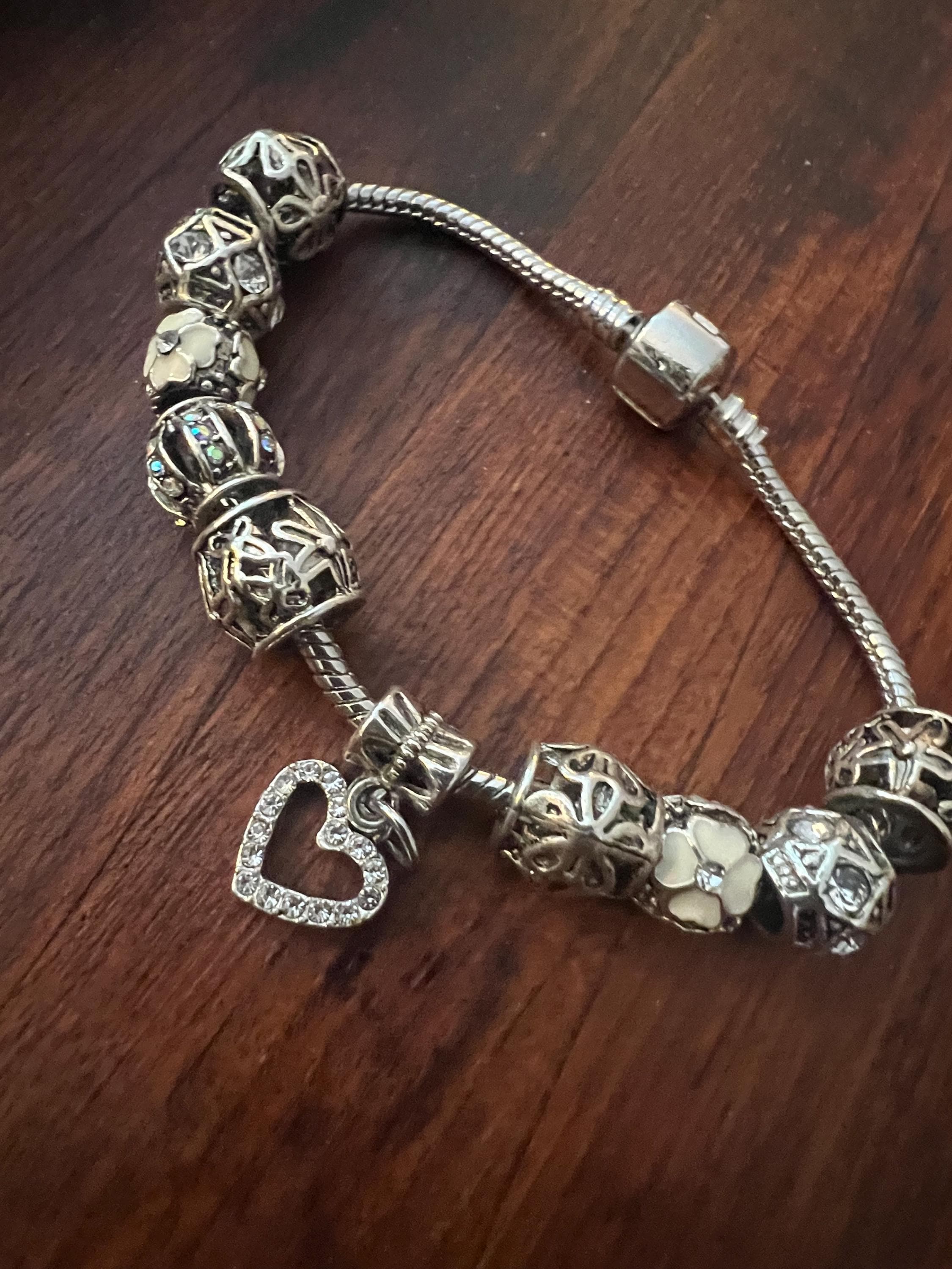 Y2K Snake Chain Charm Bracelet- Silvertone with 10 fancy Charms: ornate openwork beads with Rhinestones, white flowers and a sparkly Heart. All on a snake chain collector with fastener that opens and closes not only to allow you to place the bracelet into one’s wrist, it also allows you to add or change your beads or charm themes or color scheme. super fun!