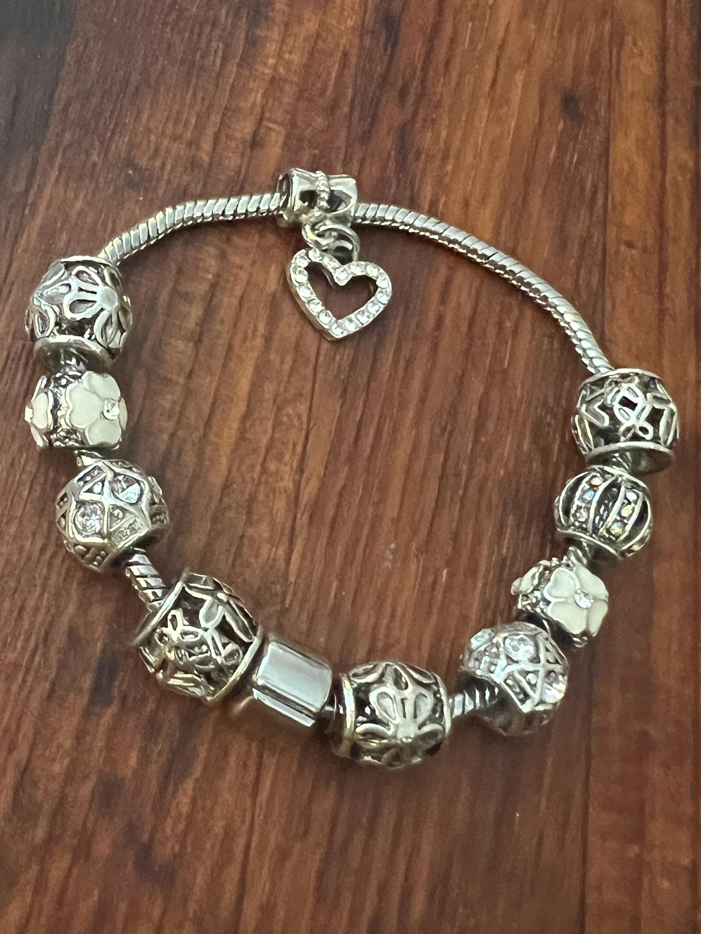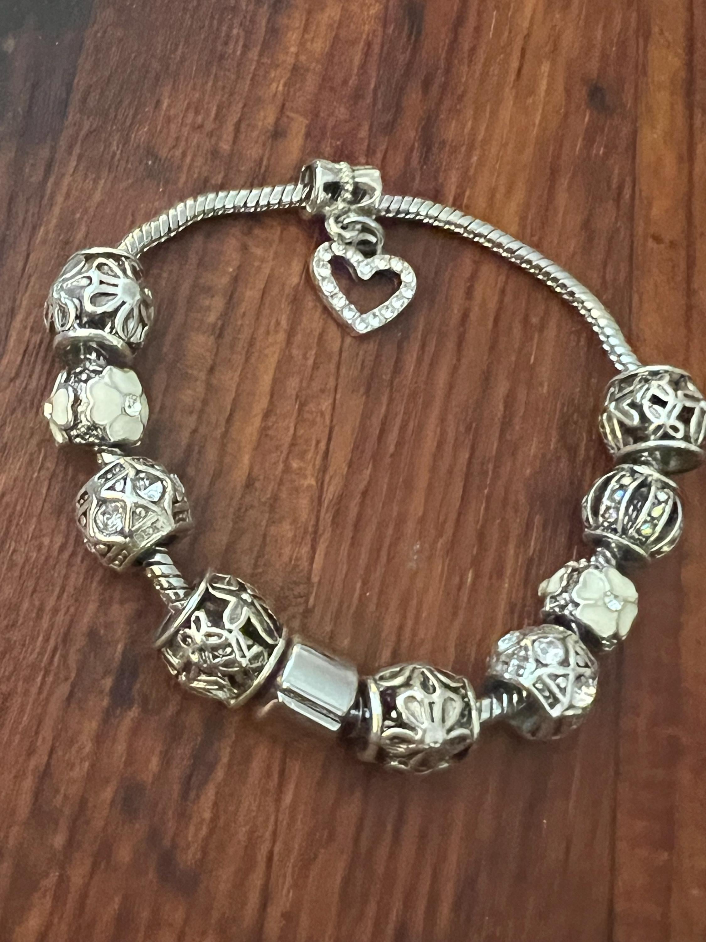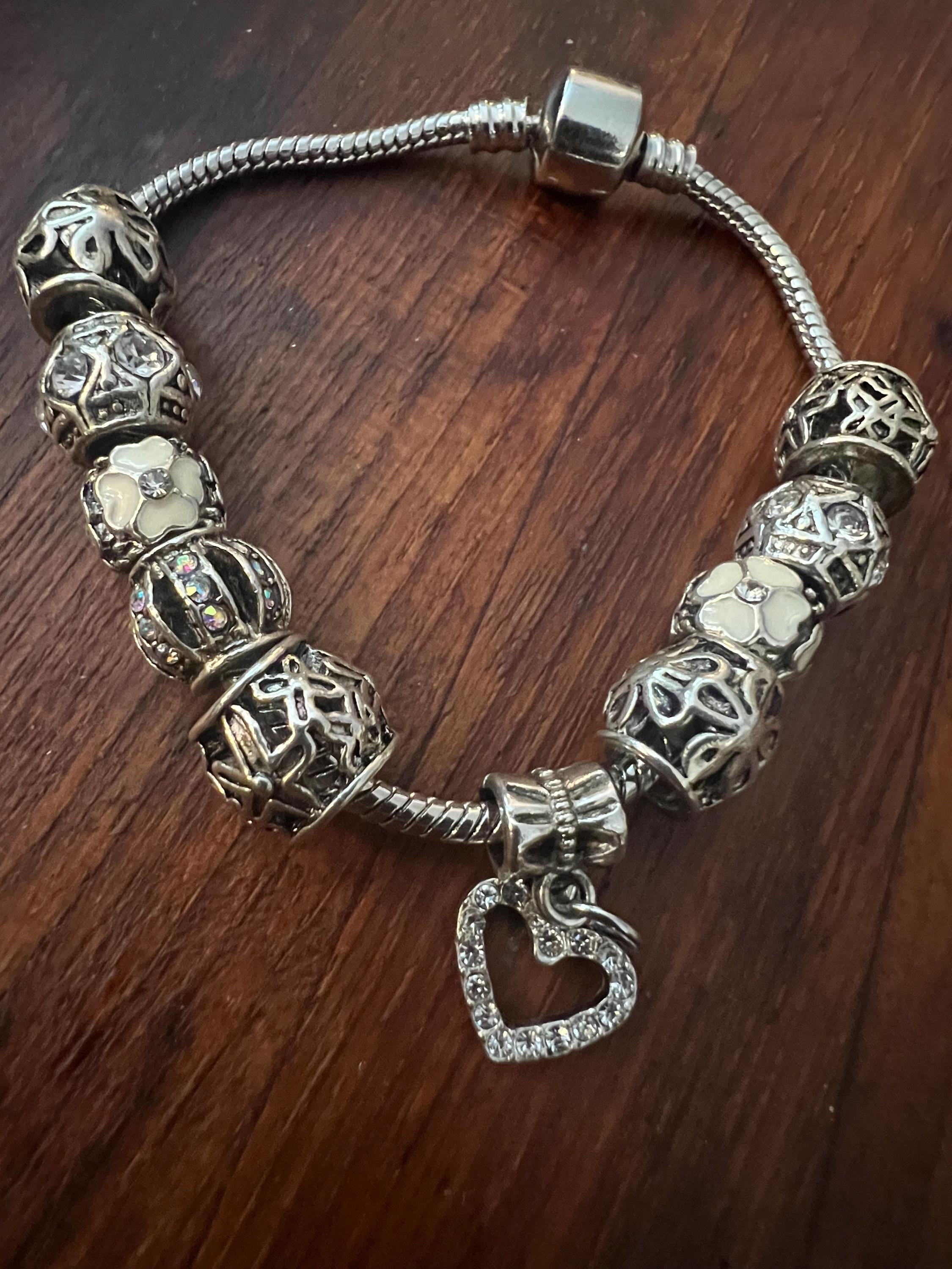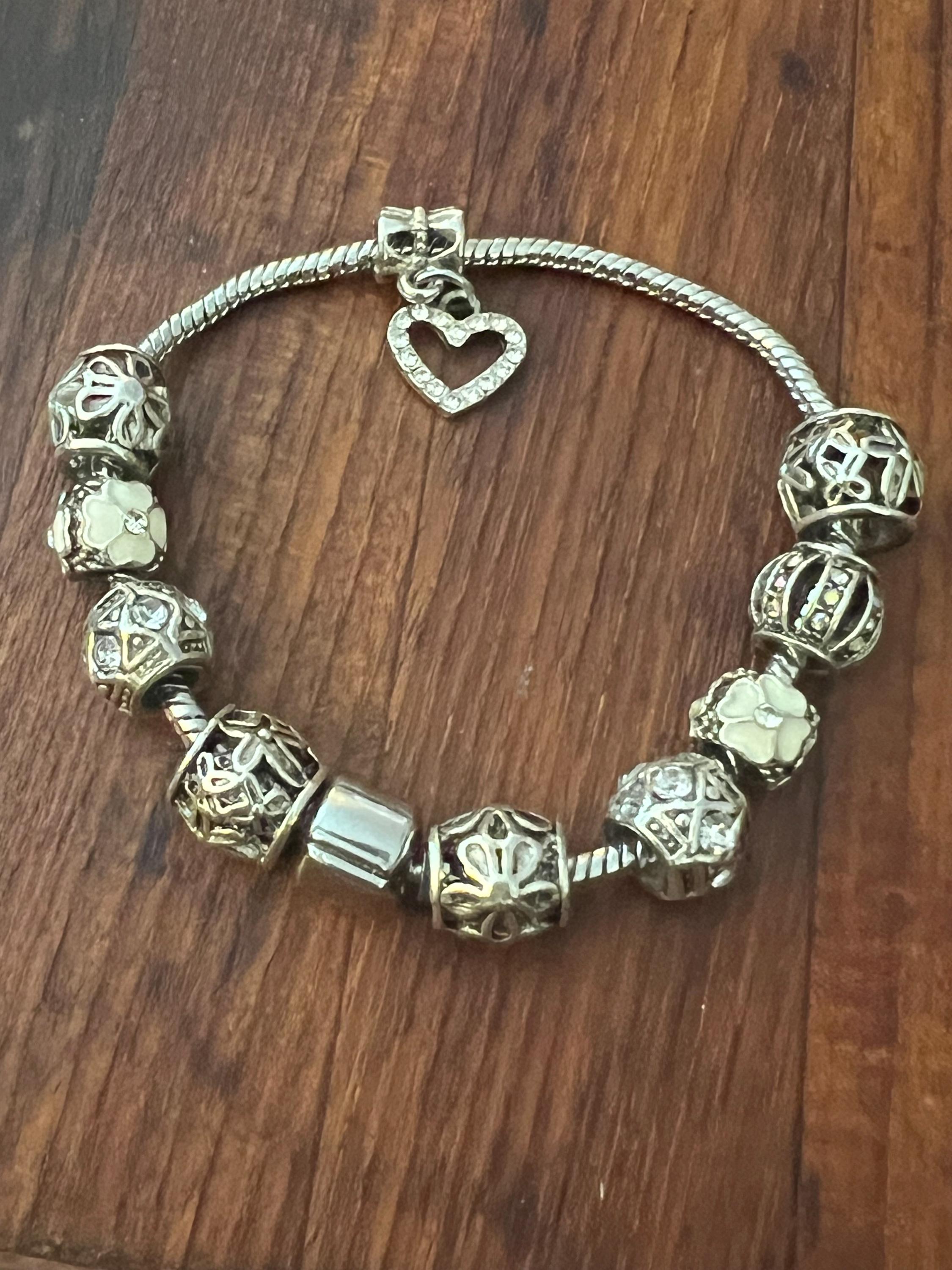 Y2K Snake Chain Charm Bracelet- Silvertone with 10 fancy Charms: ornate openwork beads with Rhinestones, white flowers and a sparkly Heart. All on a snake chain collector with fastener that opens and closes not only to allow you to place the bracelet into one’s wrist, it also allows you to add or change your beads or charm themes or color scheme. super fun!