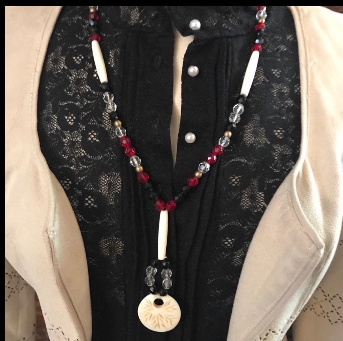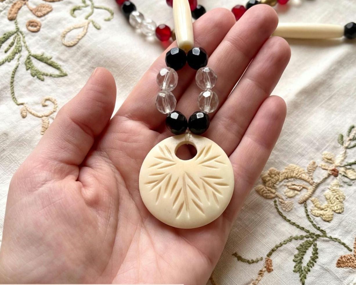 Beautiful Boho Carved Medallion on Red & Black Beaded Necklace- really nice crystal beads with carved pendant medallion.✨Not junk jewelry✨extremely nice vintage artisan made necklace. Weighted crystal glass beads- lovely ethereal carving.