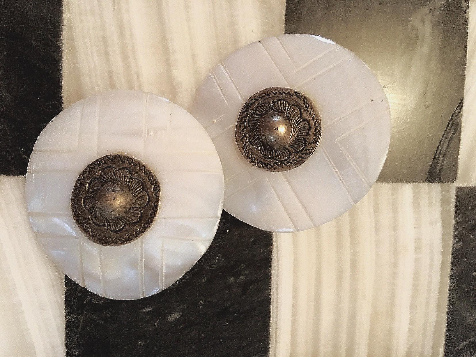 Southwestern Silver Concha Embellished Carved White Mother of Pearl Round Statement Earrings,